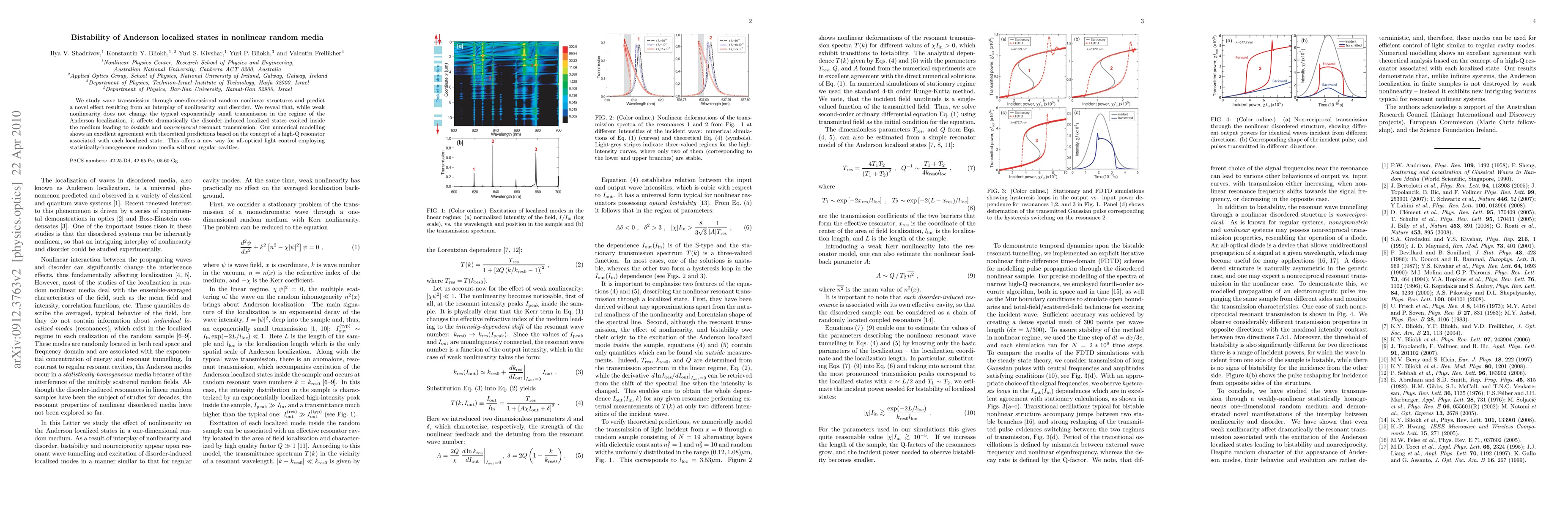 This paper investigates wave transmission in one-dimensional nonlinear random structures, predicting a novel bistable and nonreciprocal effect from the interplay of nonlinearity and disorder. Numerical modeling confirms theoretical predictions of high-Q resonators linked to localized states, suggesting a new method for all-optical light control in random media.