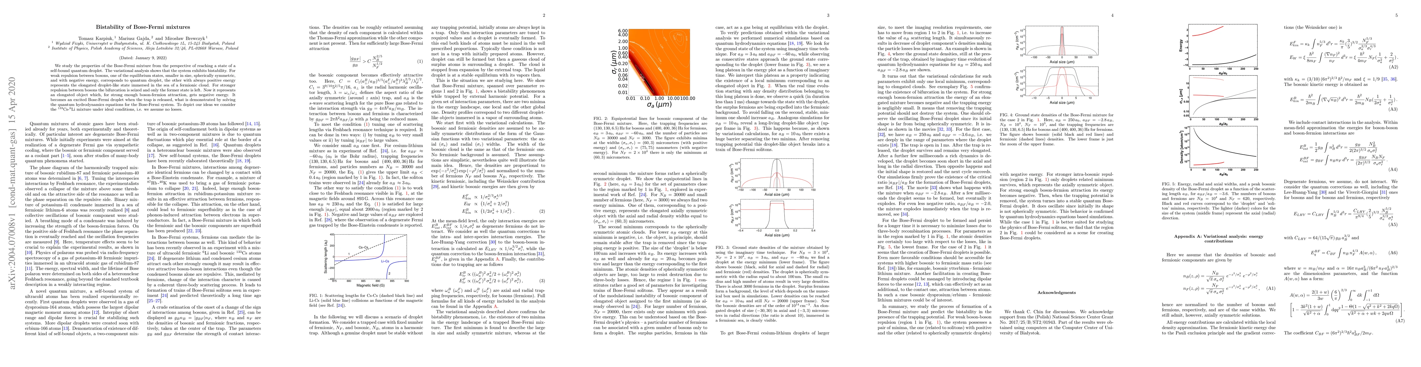 We study the properties of the Bose-Fermi mixture from the perspective of reaching a state of a self-bound quantum droplet. The variational analysis shows that the system exhibits bistability. For weak repulsion between bosons, one of the equilibrium states, smaller in size, spherically symmetric, and with negative energy, corresponds to quantum droplet, the other with always positive energy represents the elongated droplet-like state immersed in the sea of a fermionic cloud. For stronger repulsion between bosons the bifurcation is seized and only the former state is left. Now it represents an elongated object which, for strong enough boson-fermion attraction, gets negative energy. It becomes an excited Bose-Fermi droplet when the trap is released, what is demonstrated by solving the quantum hydrodynamics equations for the Bose-Fermi system. To depict our ideas we consider the $^{133}$Cs-$^6$Li mixture under ideal conditions, i.e. we assume no losses.
