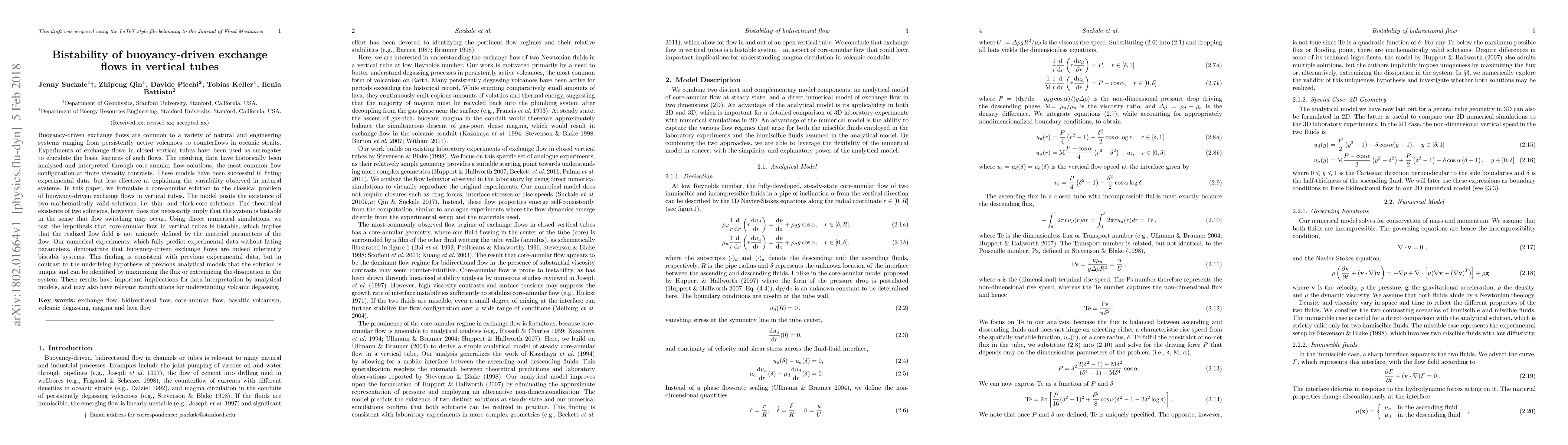 This paper investigates the bistability of buoyancy-driven exchange flows in vertical tubes, demonstrating through direct numerical simulations that such flows can exhibit two distinct flow configurations without parameter fitting. The findings challenge previous models that assumed a unique solution, highlighting the potential for flow switching and broader implications for interpreting natural systems like volcanic degassing.