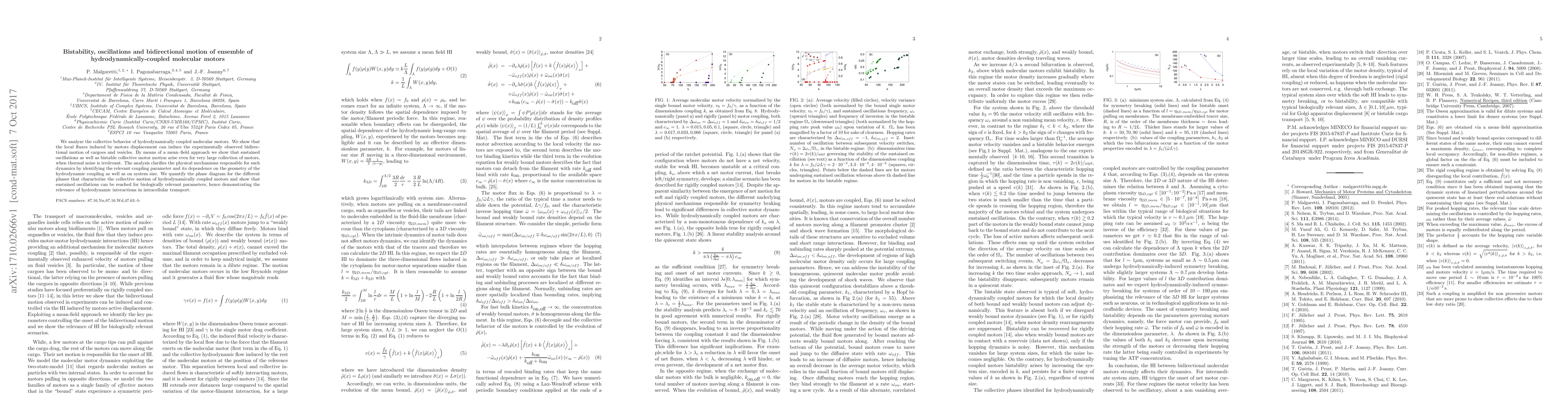 This paper investigates the collective dynamics of hydrodynamically coupled molecular motors, demonstrating that local fluxes from motor displacement can lead to bidirectional motion of cargoes. It reveals sustained oscillations and bistability in large motor ensembles, identifying the key coupling parameter and its dependence on geometry and system size, and quantifies the phase diagram for these dynamics.