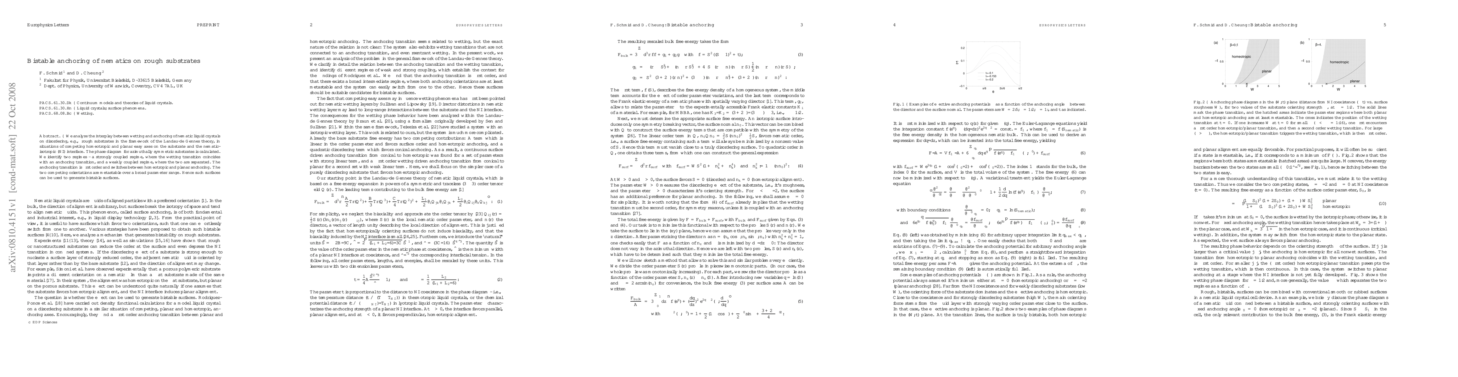 This paper investigates nematic liquid crystals on rough substrates and identifies two regimes based on the coupling between wetting and anchoring transitions. The study reveals a first-order anchoring transition that can switch between homeotropic and planar anchoring, resulting in bistable surfaces over a wide parameter range.