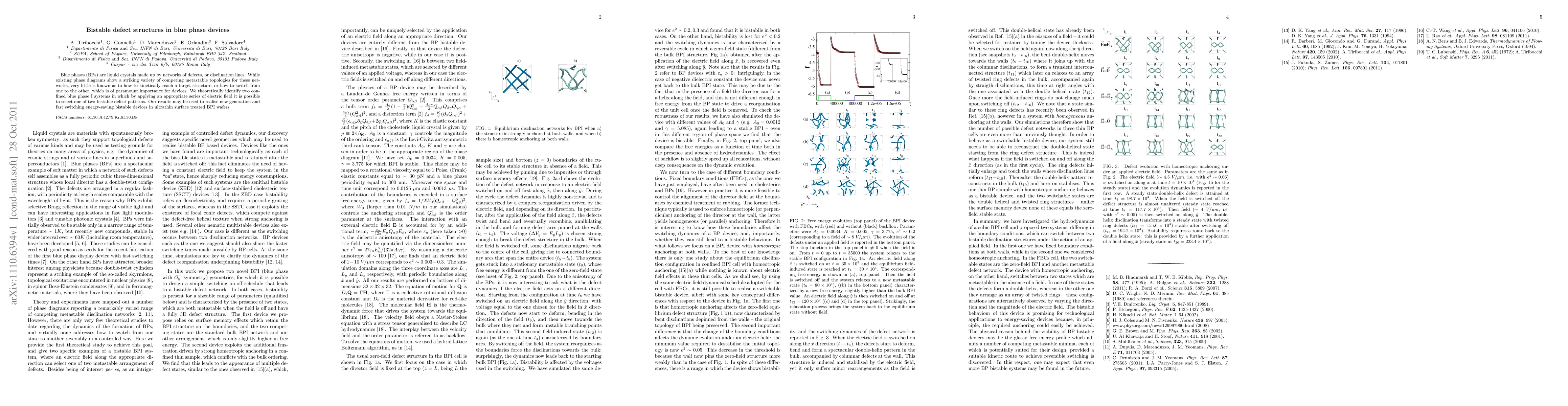 Blue phases (BPs) are liquid crystals made up by networks of defects, or disclination lines. While existing phase diagrams show a striking variety of competing metastable topologies for these networks, very little is known as to how to kinetically reach a target structure, or how to switch from one to the other, which is of paramount importance for devices. We theoretically identify two confined blue phase I systems in which by applying an appropriate series of electric field it is possible to select one of two bistable defect patterns. Our results may be used to realise new generation and fast switching energy-saving bistable devices in ultrathin surface treated BPI wafers.