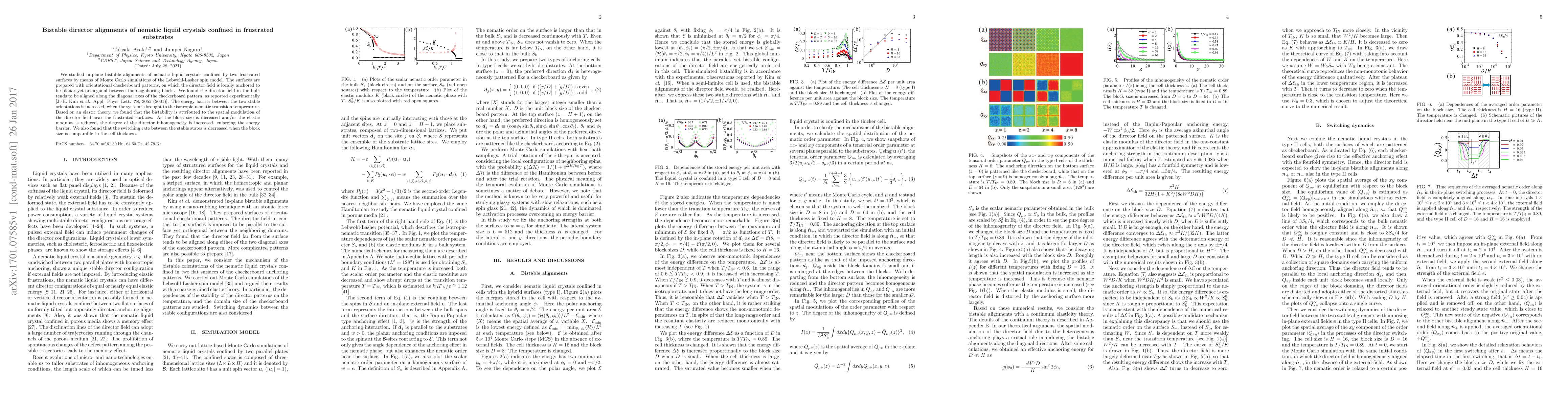 This study uses Monte Carlo simulations to investigate bistable director alignments in nematic liquid crystals confined by frustrated surfaces with checkerboard patterns. The simulations reveal increased energy barriers between stable states near the isotropic-nematic transition, attributed to spatial modulation of the director field, with larger block sizes and lower elastic moduli enhancing bistability.
