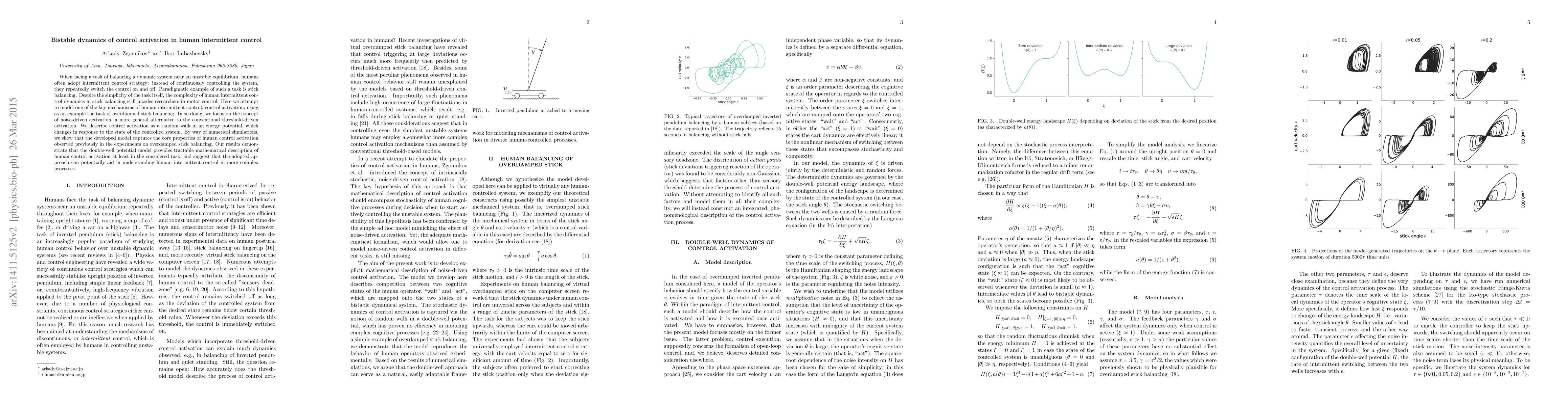 When facing a task of balancing a dynamic system near an unstable equilibrium, humans often adopt intermittent control strategy: instead of continuously controlling the system, they repeatedly switch the control on and off. Paradigmatic example of such a task is stick balancing. Despite the simplicity of the task itself, the complexity of human intermittent control dynamics in stick balancing still puzzles researchers in motor control. Here we attempt to model one of the key mechanisms of human intermittent control, control activation, using as an example the task of overdamped stick balancing. In so doing, we focus on the concept of noise-driven activation, a more general alternative to the conventional threshold-driven activation. We describe control activation as a random walk in an energy potential, which changes in response to the state of the controlled system. By way of numerical simulations, we show that the developed model captures the core properties of human control activation observed previously in the experiments on overdamped stick balancing. Our results demonstrate that the double-well potential model provides tractable mathematical description of human control activation at least in the considered task, and suggest that the adopted approach can potentially aid in understanding human intermittent control in more complex processes.