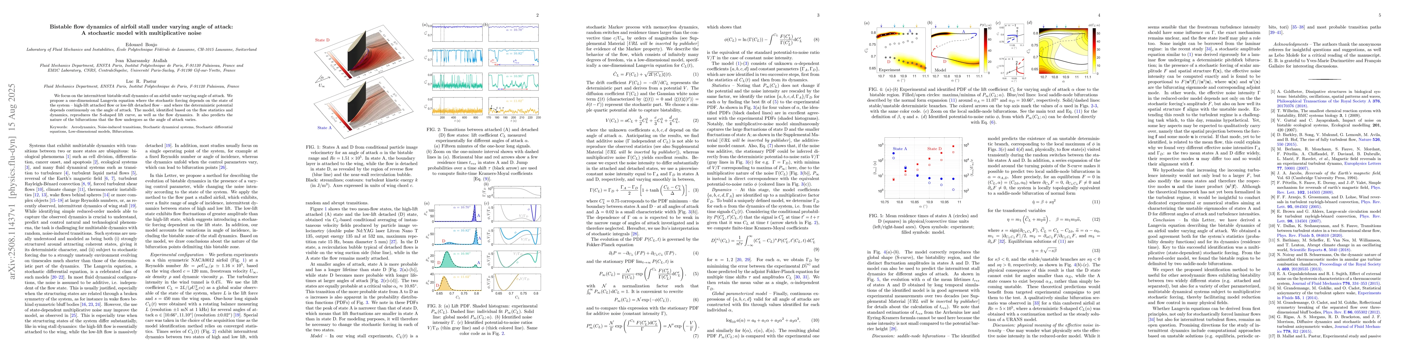We focus on the intermittent bistable stall dynamics of an airfoil under varying angle of attack. We propose a one-dimensional Langevin equation where the stochastic forcing depends on the state of the system -- high-lift attached flow or low-lift detached flow -- and where the deterministic potential depends continuously on the angle of attack. The model, identified based on the flow statistics and dynamics, reproduces the S-shaped lift curve, as well as the flow dynamics. It also predicts the nature of the bifurcations that the flow undergoes as the angle of attack varies.