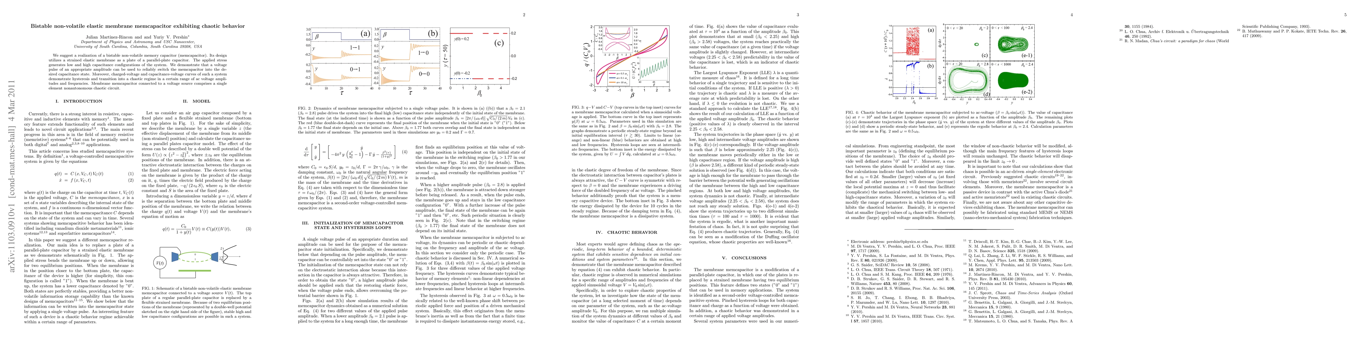 A new type of memory capacitor called a memcapacitor exhibits bistable behavior with chaotic transitions when subjected to specific voltage pulses and frequencies. This discovery has implications for the development of novel, non-autonomous chaotic circuits.