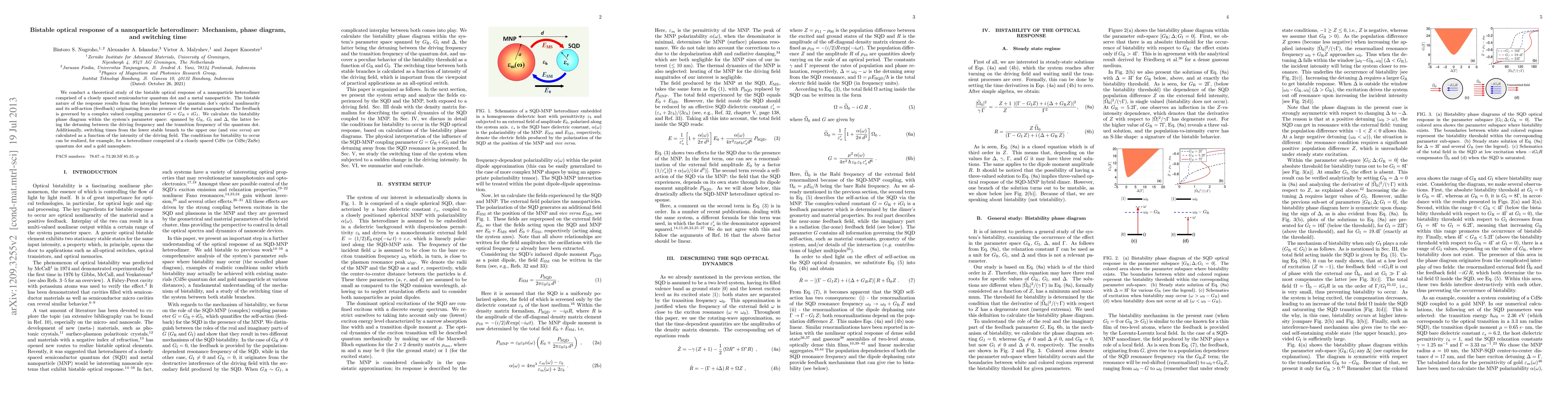 This paper theoretically investigates the bistable optical response of a nanoparticle heterodimer, revealing the interplay between a semiconductor quantum dot's optical nonlinearity and feedback from a nearby metal nanoparticle. The study identifies critical values for the coupling parameter $G$ that determine bistability and calculates the phase diagram and switching times, demonstrating potential applications in optical switching devices.