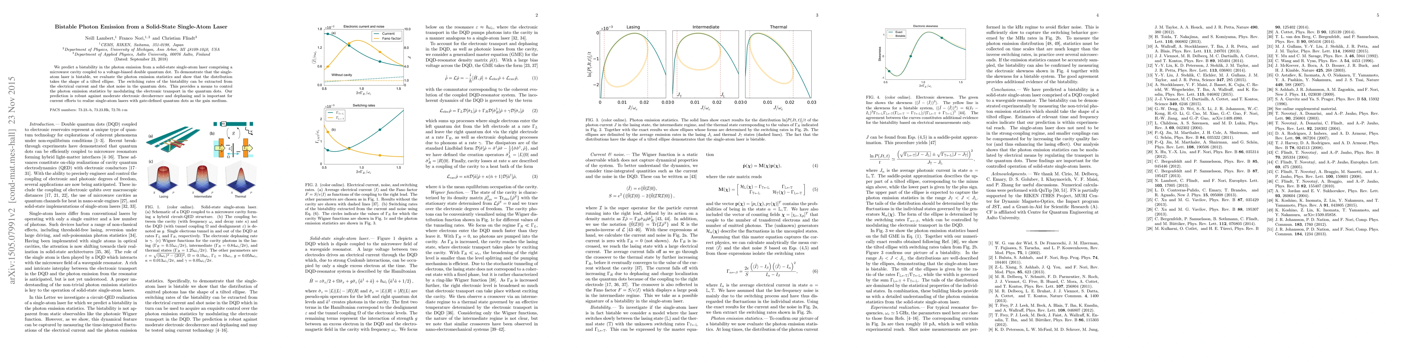 This paper predicts bistability in photon emission from a solid-state single-atom laser using a microwave cavity coupled to a voltage-biased double quantum dot. The researchers demonstrate this bistability through photon emission statistics shaped as tilted ellipses, enabling control via electronic transport modulation.