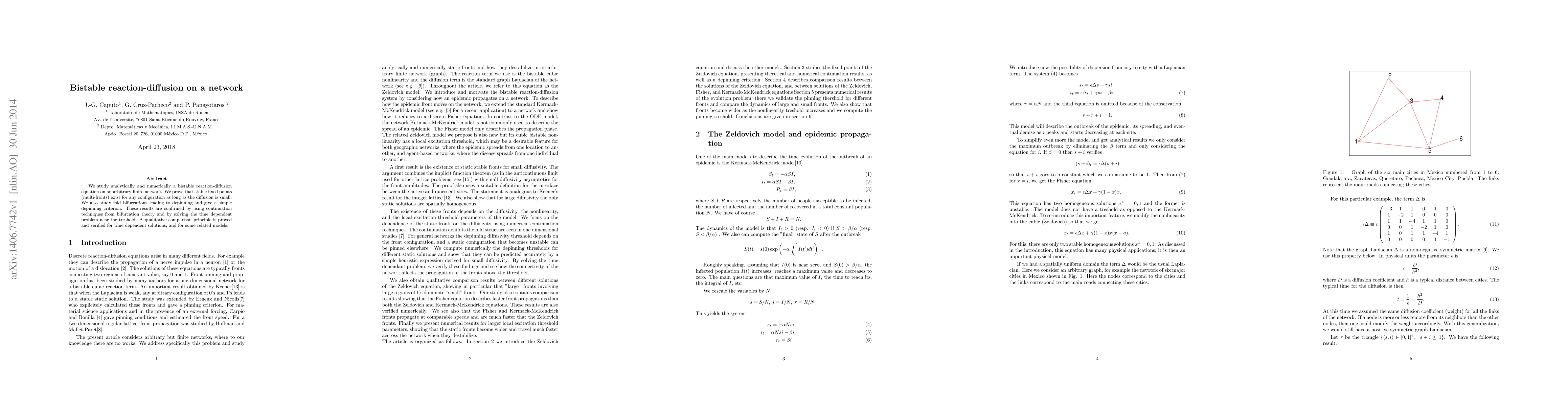 We study analytically and numerically a bistable reaction-diffusion equation on an arbitrary finite network. We prove that stable fixed points (multi-fronts) exist for any configuration as long as the diffusion is small. We also study fold bifurcations leading to depinning and give a simple depinning criterion. These results are confirmed by using continuation techniques from bifurcation theory and by solving the time dependent problem near the treshold. A qualitative comparison principle is proved and verified for time dependent solutions, and for some related models.