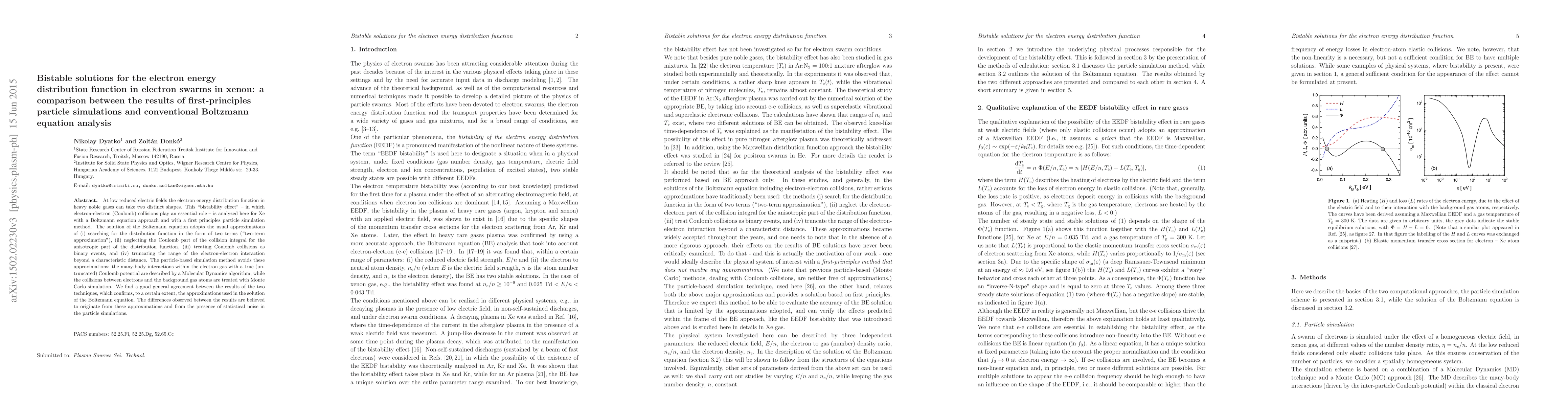 At low reduced electric fields the electron energy distribution function in heavy noble gases can take two distinct shapes. This "bistability effect" - in which electron-electron (Coulomb) collisions play an essential role - is analyzed here for Xe with a Boltzmann equation approach and with a first principles particle simulation method. The solution of the Boltzmann equation adopts the usual approximations of (i) searching for the distribution function in the form of two terms ("two-term approximation"), (ii) neglecting the Coulomb part of the collision integral for the anisotropic part of the distribution function, (iii) treating Coulomb collisions as binary events, and (iv) truncating the range of the electron-electron interaction beyond a characteristic distance. The particle-based simulation method avoids these approximations: the many-body interactions within the electron gas with a true (un- truncated) Coulomb potential are described by a Molecular Dynamics algorithm, while the collisions between electrons and the background gas atoms are treated with Monte Carlo simulation. We find a good general agreement between the results of the two techniques, which confirms, to a certain extent, the approximations used in the solution of the Boltzmann equation. The differences observed between the results are believed to originate from these approximations and from the presence of statistical noise in the particle simulations.