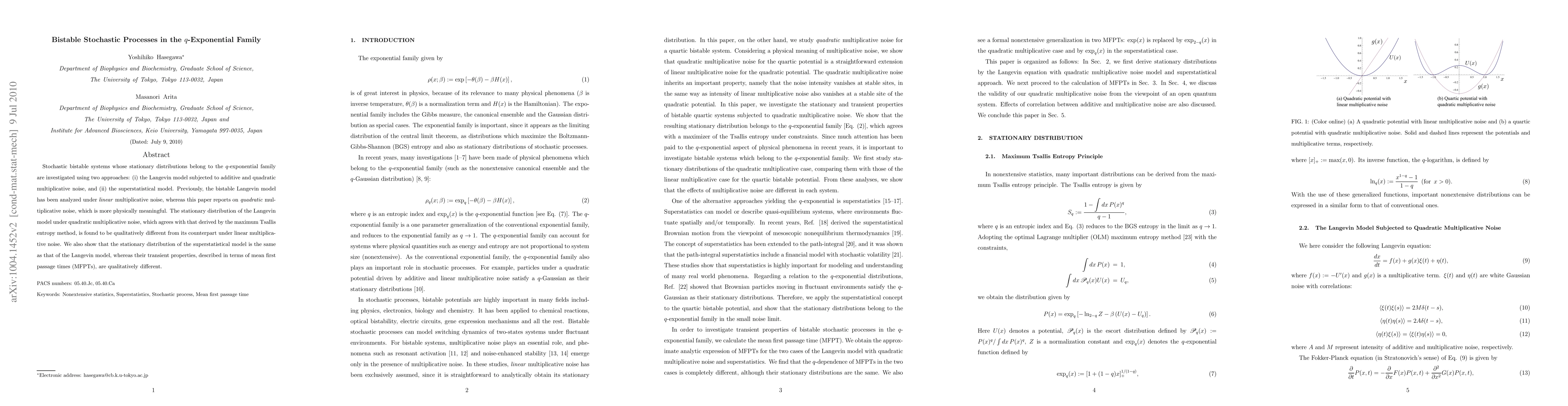 This paper investigates bistable stochastic processes within the q-exponential family using two models: the Langevin model with quadratic multiplicative noise and the superstatistical model. The study finds that the stationary distribution differs under quadratic versus linear multiplicative noise, and while both models share the same stationary distribution, their transient behaviors differ significantly.