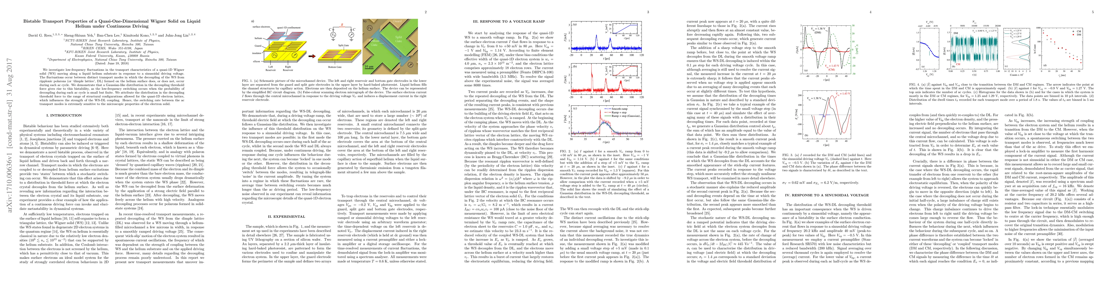 This paper explores the bistable transport behavior of a quasi-1D Wigner solid on liquid helium under continuous driving. It reveals that the system fluctuates between transport modes based on whether the solid decouples from ripplonic polarons during each ac cycle, with the switching rate highly sensitive to the electron lattice's structural configurations.