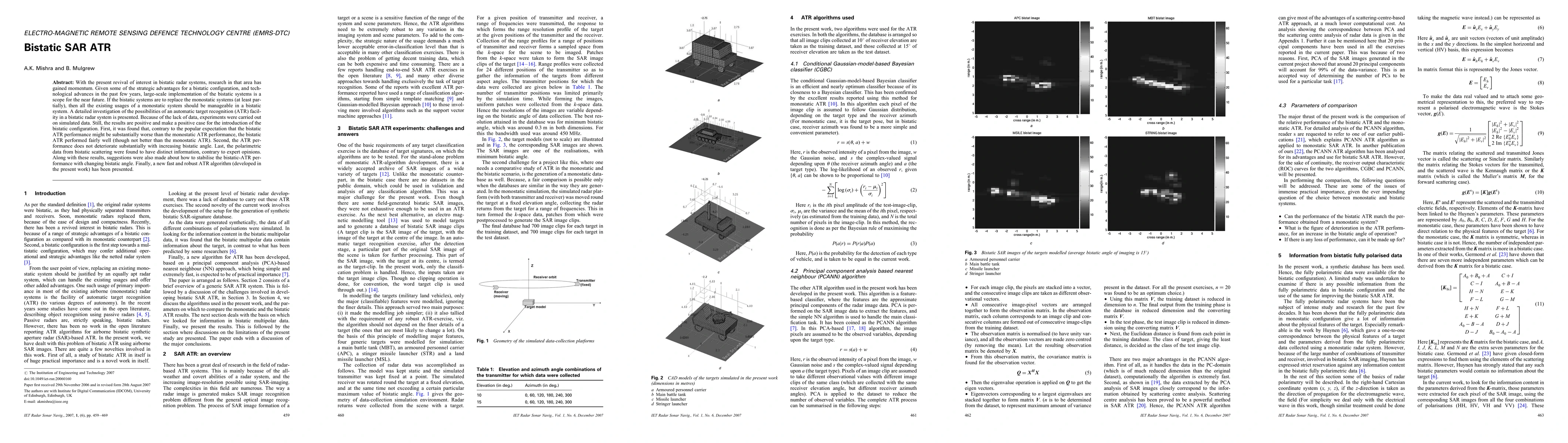 With the present revival of interest in bistatic radar systems, research in that area has gained momentum. Given some of the strategic advantages for a bistatic configuration, and tech- nological advances in the past few years, large-scale implementation of the bistatic systems is a scope for the near future. If the bistatic systems are to replace the monostatic systems (at least par- tially), then all the existing usages of a monostatic system should be manageable in a bistatic system. A detailed investigation of the possibilities of an automatic target recognition (ATR) facil- ity in a bistatic radar system is presented. Because of the lack of data, experiments were carried out on simulated data. Still, the results are positive and make a positive case for the introduction of the bistatic configuration. First, it was found that, contrary to the popular expectation that the bistatic ATR performance might be substantially worse than the monostatic ATR performance, the bistatic ATR performed fairly well (though not better than the monostatic ATR). Second, the ATR per- formance does not deteriorate substantially with increasing bistatic angle. Last, the polarimetric data from bistatic scattering were found to have distinct information, contrary to expert opinions. Along with these results, suggestions were also made about how to stabilise the bistatic-ATR per- formance with changing bistatic angle. Finally, a new fast and robust ATR algorithm (developed in the present work) has been presented.