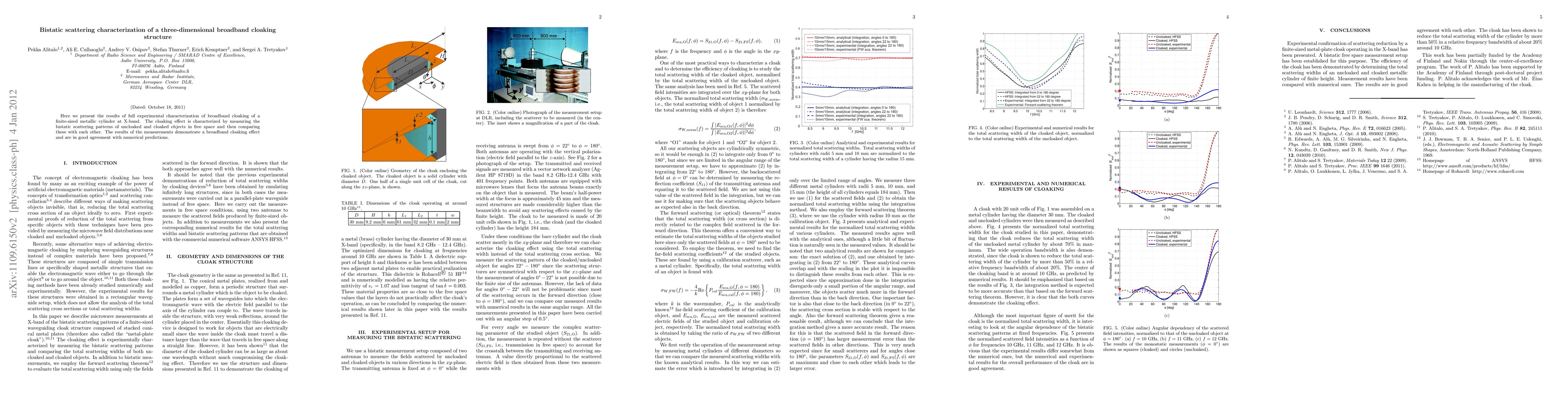 This paper experimentally characterizes a broadband cloaking structure for a metallic cylinder at X-band frequencies, demonstrating a cloaking effect through bistatic scattering pattern measurements. The results show effective cloaking and align well with numerical simulations.