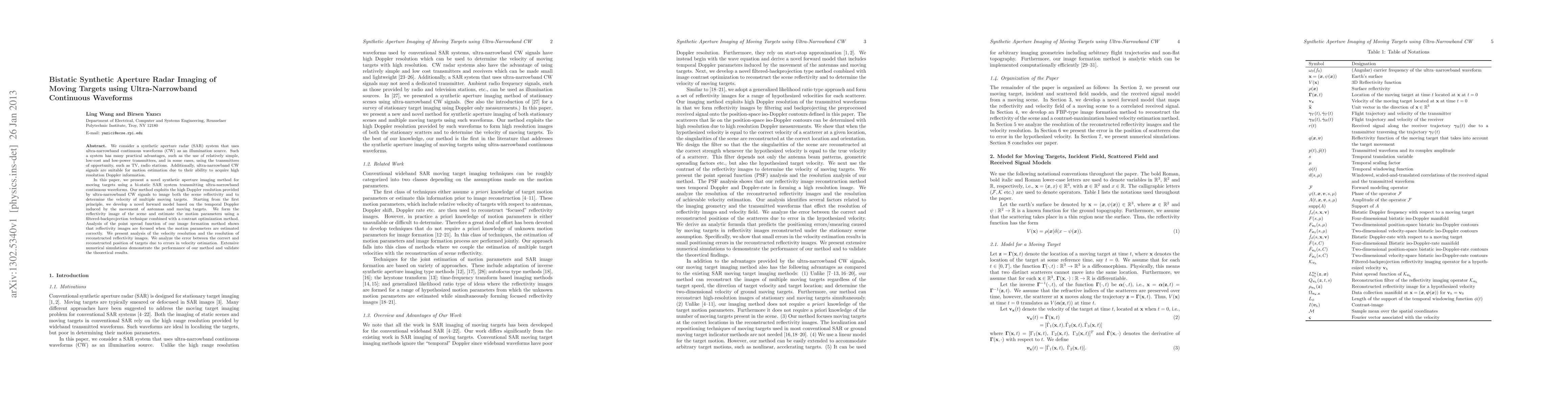 This paper proposes a novel synthetic aperture imaging method for moving targets using a bi-static SAR system with ultra-narrowband continuous waveforms. The method leverages high Doppler resolution to image scene reflectivity and estimate target velocities, validated through extensive numerical simulations.