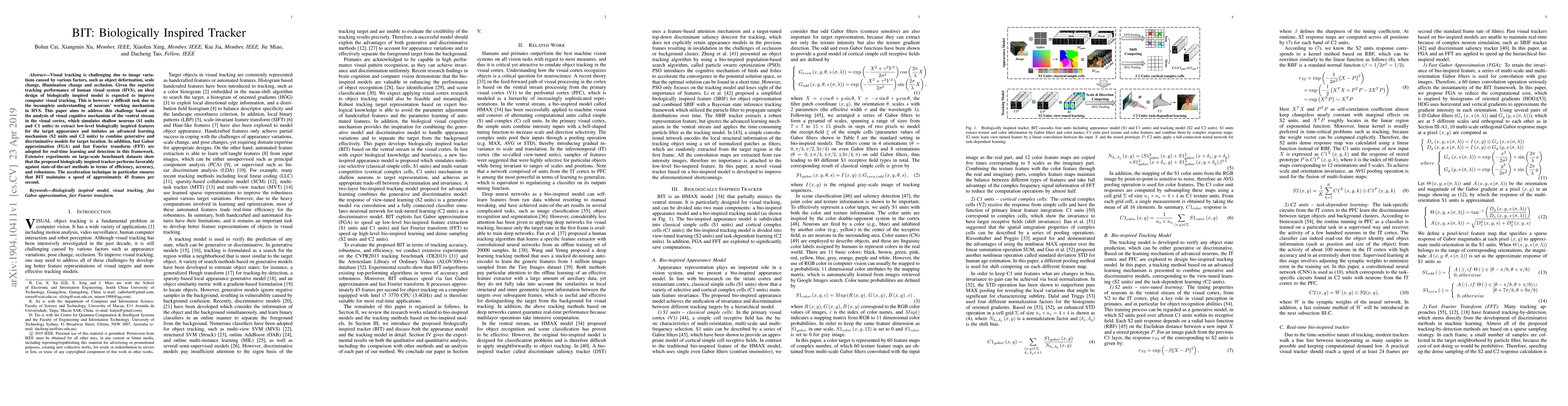 Visual tracking is challenging due to image variations caused by various factors, such as object deformation, scale change, illumination change and occlusion. Given the superior tracking performance of human visual system (HVS), an ideal design of biologically inspired model is expected to improve computer visual tracking. This is however a difficult task due to the incomplete understanding of neurons' working mechanism in HVS. This paper aims to address this challenge based on the analysis of visual cognitive mechanism of the ventral stream in the visual cortex, which simulates shallow neurons (S1 units and C1 units) to extract low-level biologically inspired features for the target appearance and imitates an advanced learning mechanism (S2 units and C2 units) to combine generative and discriminative models for target location. In addition, fast Gabor approximation (FGA) and fast Fourier transform (FFT) are adopted for real-time learning and detection in this framework. Extensive experiments on large-scale benchmark datasets show that the proposed biologically inspired tracker performs favorably against state-of-the-art methods in terms of efficiency, accuracy, and robustness. The acceleration technique in particular ensures that BIT maintains a speed of approximately 45 frames per second.