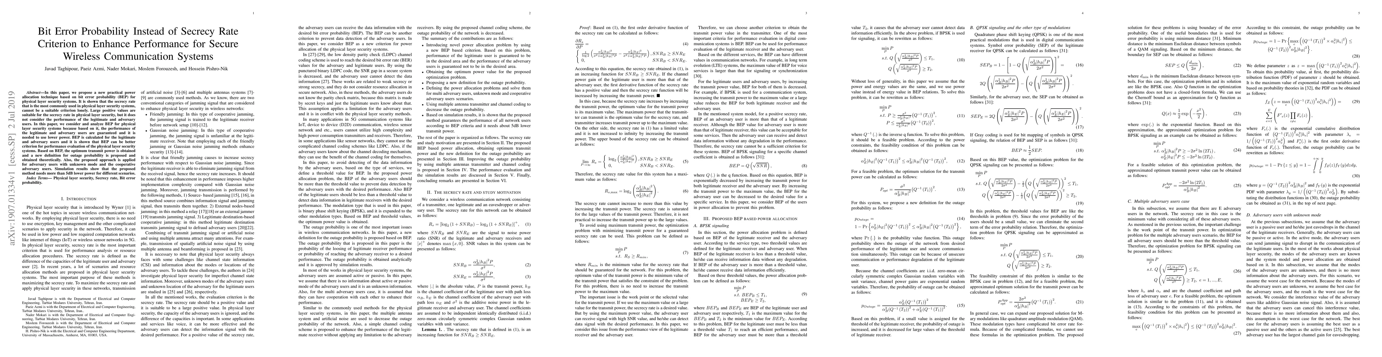 A new power allocation technique based on bit error probability (BEP) is proposed to enhance performance for secure wireless communication systems, requiring less power than traditional secrecy rate criteria.