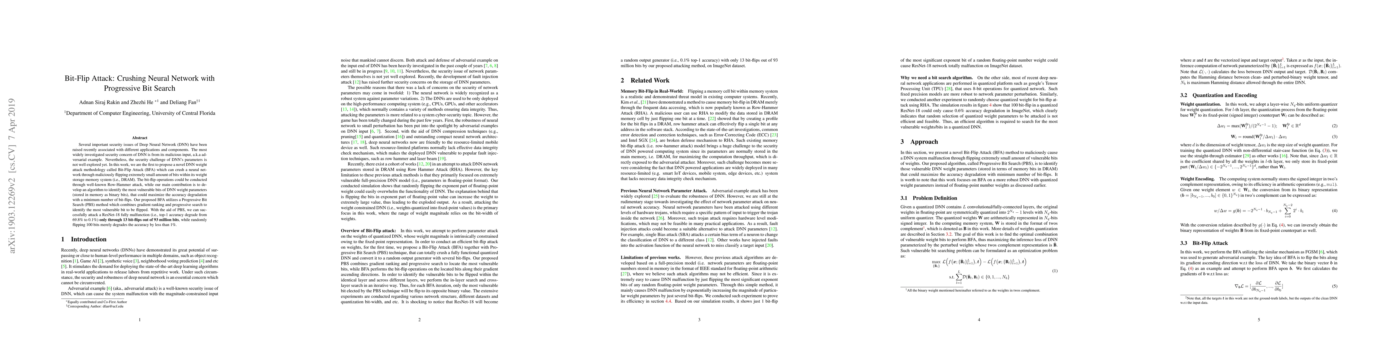 This paper introduces a novel Bit-Flip Attack (BFA) targeting the weights of Deep Neural Networks (DNNs) to degrade their performance through minimal bit-flips in memory. The proposed Progressive Bit Search (PBS) algorithm identifies the most vulnerable bits, achieving - The generated text has been blocked by our content filters.