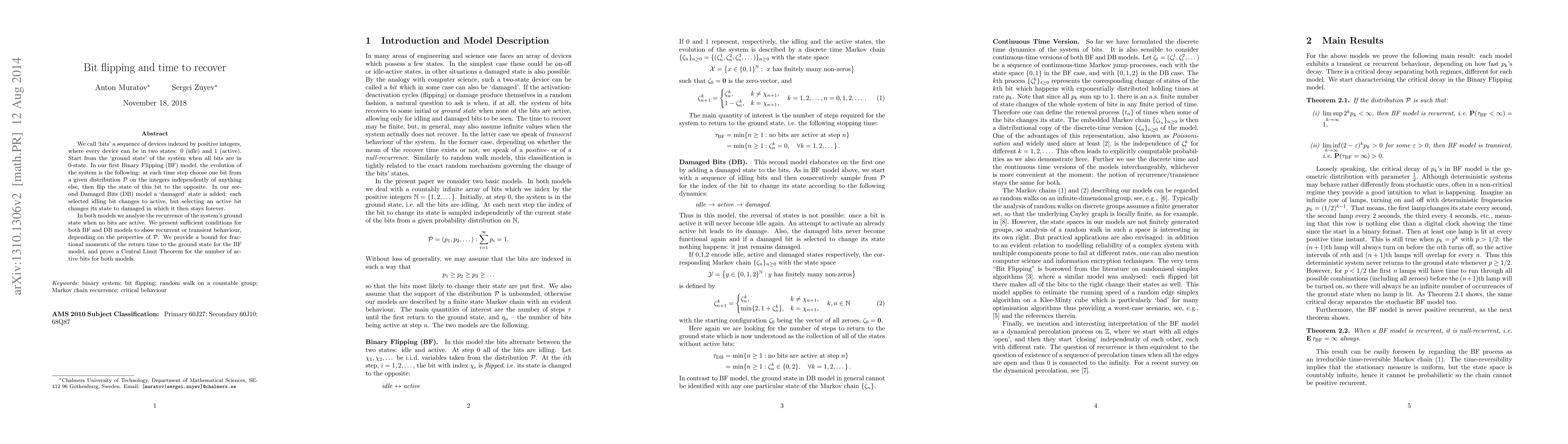 We call `bits' a sequence of devices indexed by positive integers, where every device can be in two states: $0$ (idle) and $1$ (active). Start from the `ground state' of the system when all bits are in $0$-state. In our first Binary Flipping (BF) model, the evolution of the system is the following: at each time step choose one bit from a given distribution $\mathcal{P}$ on the integers independently of anything else, then flip the state of this bit to the opposite. In our second Damaged Bits (DB) model a `damaged' state is added: each selected idling bit changes to active, but selecting an active bit changes its state to damaged in which it then stays forever. In both models we analyse the recurrence of the system's ground state when no bits are active. We present sufficient conditions for both BF and DB models to show recurrent or transient behaviour, depending on the properties of $\mathcal{P}$. We provide a bound for fractional moments of the return time to the ground state for the BF model, and prove a Central Limit Theorem for the number of active bits for both models.