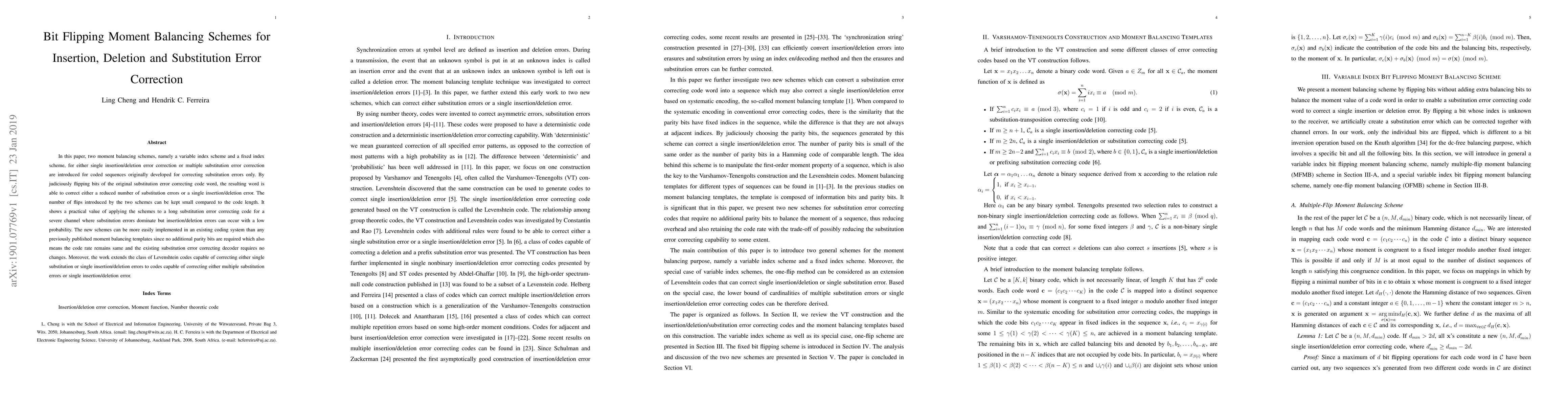 This paper introduces two bit flipping moment balancing schemes—variable and fixed index—to correct either single insertion/deletion errors or multiple substitution errors in coded sequences. These schemes require minimal bit flips and can be easily integrated into existing coding systems without altering code rate or decoders.