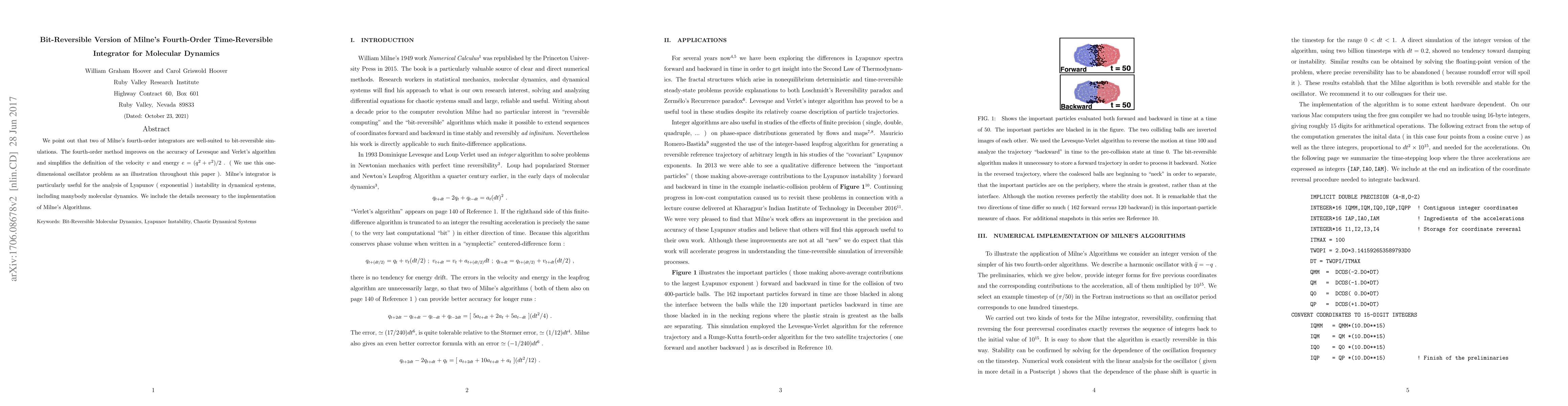 We point out that two of Milne's fourth-order integrators are well-suited to bit-reversible simulations. The fourth-order method improves on the accuracy of Levesque and Verlet's algorithm and simplifies the definition of the velocity $v$ and energy $e = (q^2 + v^2)/2$ . ( We use this one-dimensional oscillator problem as an illustration throughout this paper ). Milne's integrator is particularly useful for the analysis of Lyapunov ( exponential ) instability in dynamical systems, including manybody molecular dynamics. We include the details necessary to the implementation of Milne's Algorithms.