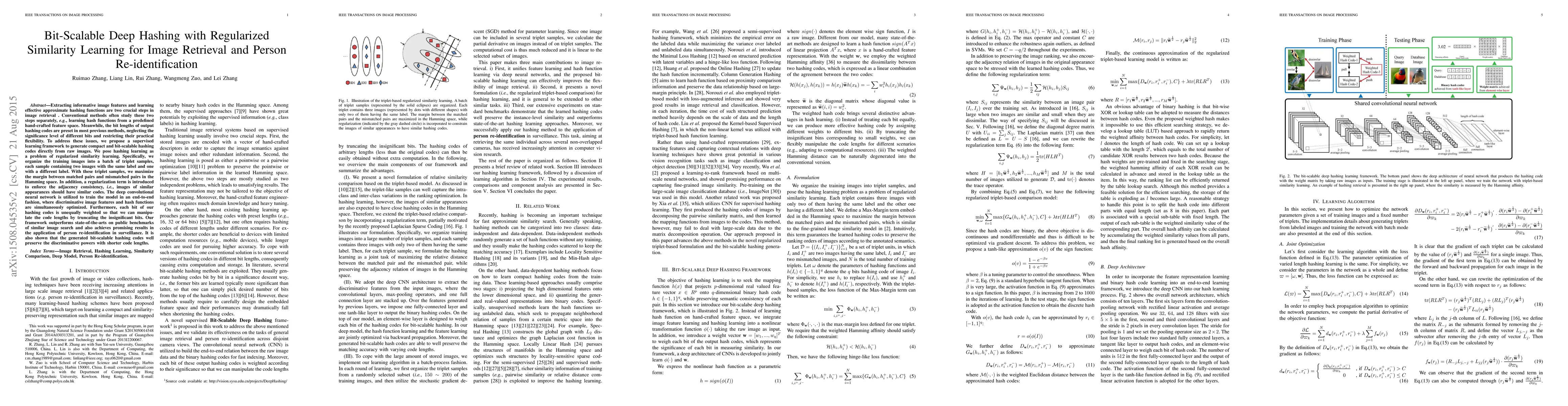 Extracting informative image features and learning effective approximate hashing functions are two crucial steps in image retrieval . Conventional methods often study these two steps separately, e.g., learning hash functions from a predefined hand-crafted feature space. Meanwhile, the bit lengths of output hashing codes are preset in most previous methods, neglecting the significance level of different bits and restricting their practical flexibility. To address these issues, we propose a supervised learning framework to generate compact and bit-scalable hashing codes directly from raw images. We pose hashing learning as a problem of regularized similarity learning. Specifically, we organize the training images into a batch of triplet samples, each sample containing two images with the same label and one with a different label. With these triplet samples, we maximize the margin between matched pairs and mismatched pairs in the Hamming space. In addition, a regularization term is introduced to enforce the adjacency consistency, i.e., images of similar appearances should have similar codes. The deep convolutional neural network is utilized to train the model in an end-to-end fashion, where discriminative image features and hash functions are simultaneously optimized. Furthermore, each bit of our hashing codes is unequally weighted so that we can manipulate the code lengths by truncating the insignificant bits. Our framework outperforms state-of-the-arts on public benchmarks of similar image search and also achieves promising results in the application of person re-identification in surveillance. It is also shown that the generated bit-scalable hashing codes well preserve the discriminative powers with shorter code lengths.