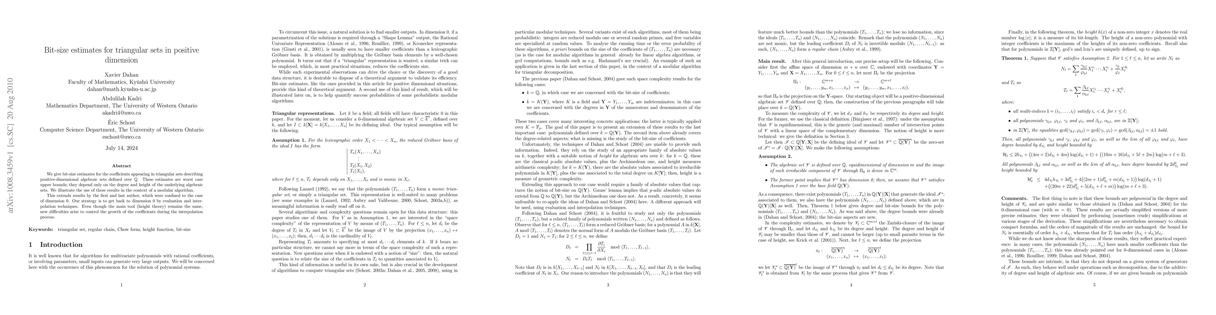 The paper provides worst-case bit-size estimates for coefficients in triangular sets describing algebraic sets of positive dimension over the rational numbers Q. It extends earlier results to higher dimensions using interpolation techniques.