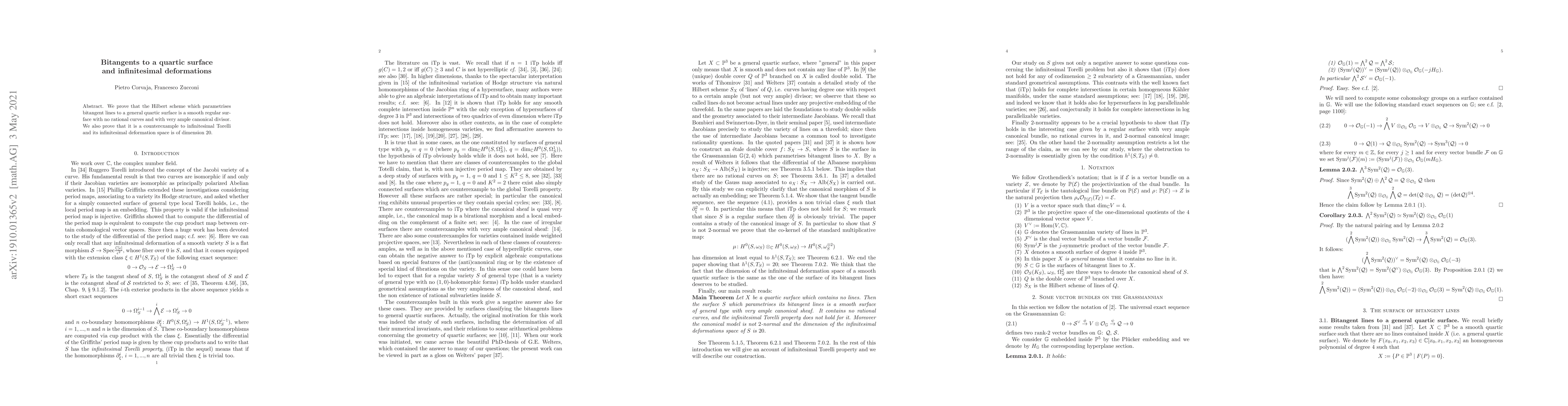 Summary: The paper demonstrates that the Hilbert scheme for bitangent lines to a general quartic surface serves as a counterexample to the infinitesimal Torelli theorem and is a smooth, regular surface without rational curves, featuring a very ample canonical divisor.