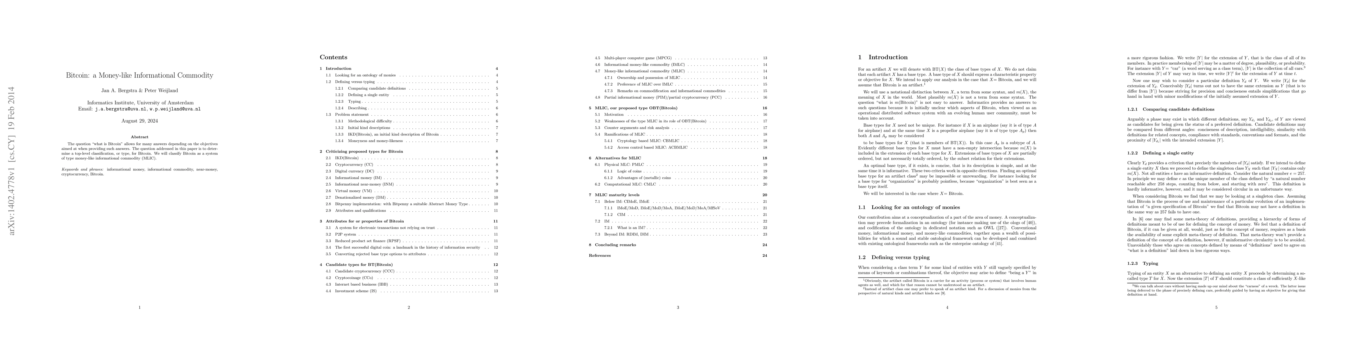 Summary: This paper explores the classification of Bitcoin, ultimately categorizing it as a money-like informational commodity (MLIC). The study aims to provide a top-level understanding of Bitcoin's nature based on its characteristics and functions.