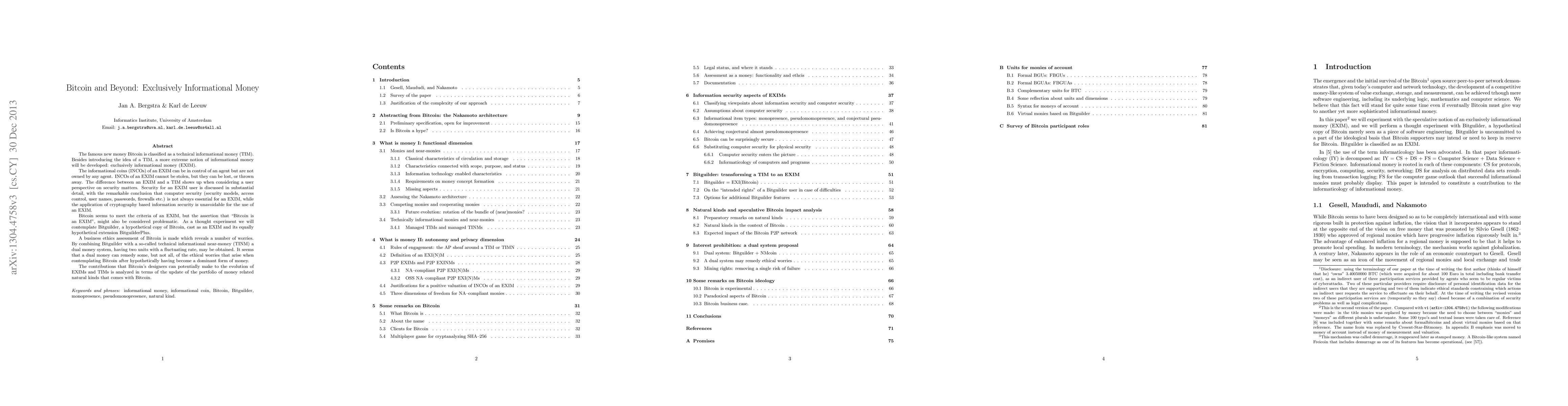 The famous new money Bitcoin is classified as a technical informational money (TIM). Besides introducing the idea of a TIM, a more extreme notion of informational money will be developed: exclusively informational money (EXIM). The informational coins (INCOs) of an EXIM can be in control of an agent but are not owned by any agent. INCOs of an EXIM cannot be stolen, but they can be lost, or thrown away. The difference between an EXIM and a TIM shows up when considering a user perspective on security matters. Security for an EXIM user is discussed in substantial detail, with the remarkable conclusion that computer security (security models, access control, user names, passwords, firewalls etc.) is not always essential for an EXIM, while the application of cryptography based information security is unavoidable for the use of an EXIM. Bitcoin seems to meet the criteria of an EXIM, but the assertion that "Bitcoin is an EXIM", might also be considered problematic. As a thought experiment we will contemplate Bitguilder, a hypothetical copy of Bitcoin that qualifies as an EXIM. A business ethics assessment of Bitcoin is made which reveals a number of worries. By combining Bitguilder with a so-called technical informational near-money (TINM) a dual money system, having two units with a fluctuating rate, may be obtained. It seems that a dual money can remedy some, but not all, of the ethical worries that arise when contemplating Bitcoin after hypothetically having become a dominant form of money. The contributions that Bitcoin's designers can potentially make to the evolution of EXIMs and TIMs is analyzed in terms of the update of the portfolio of money related natural kinds that comes with Bitcoin.