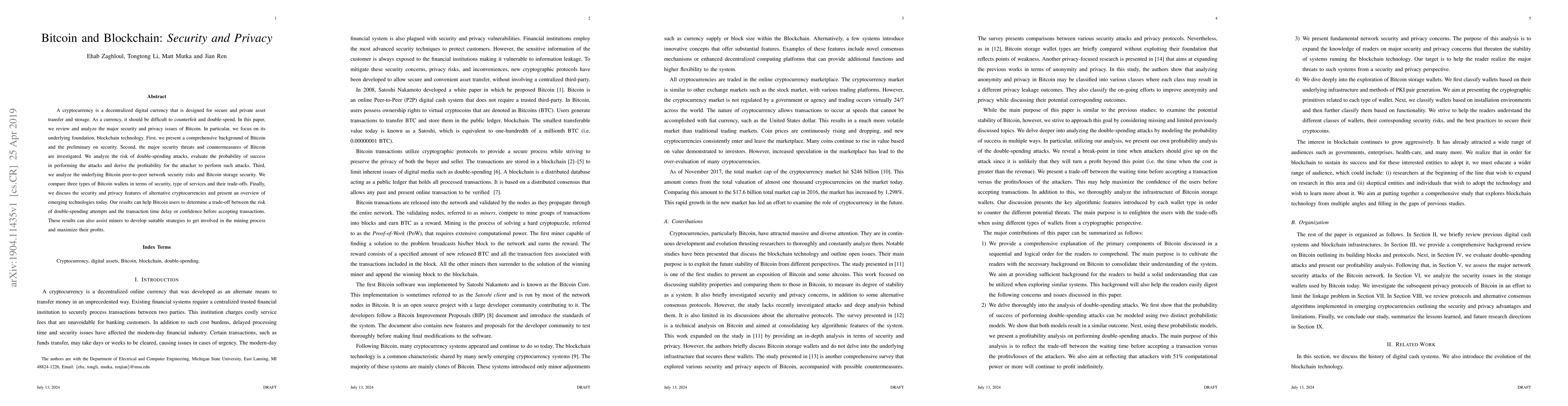 This paper reviews Bitcoin's security and privacy issues, focusing on blockchain technology, and evaluates the risks of double-spending attacks, network security, and storage security of Bitcoin wallets, providing insights for users and miners on managing these risks.