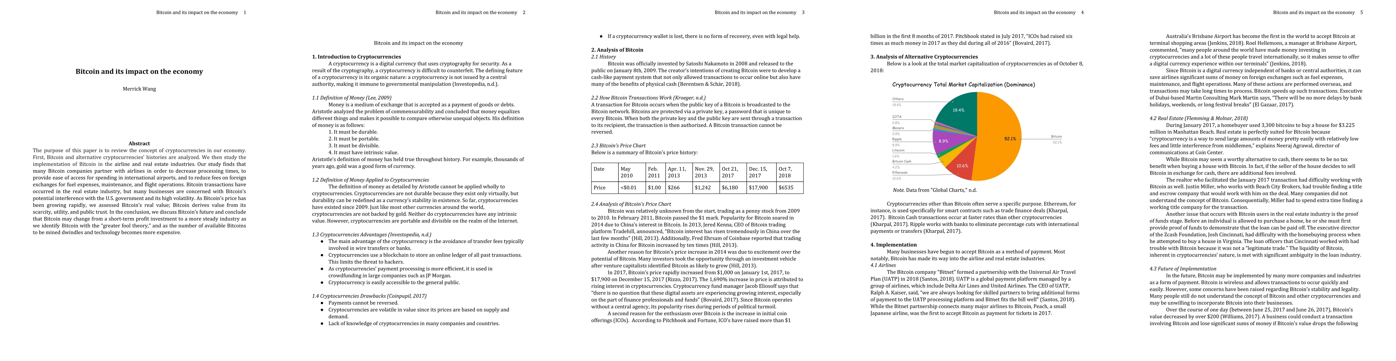 The purpose of this paper is to review the concept of cryptocurrencies in our economy. First, Bitcoin and alternative cryptocurrencies' histories are analyzed. We then study the implementation of Bitcoin in the airline and real estate industries. Our study finds that many Bitcoin companies partner with airlines in order to decrease processing times, to provide ease of access for spending in international airports, and to reduce fees on foreign exchanges for fuel expenses, maintenance, and flight operations. Bitcoin transactions have occurred in the real estate industry, but many businesses are concerned with Bitcoin's potential interference with the U.S. government and its high volatility. As Bitcoin's price has been growing rapidly, we assessed Bitcoin's real value; Bitcoin derives value from its scarcity, utility, and public trust. In the conclusion, we discuss Bitcoin's future and conclude that Bitcoin may change from a short-term profit investment to a more steady industry as we identify Bitcoin with the "greater fool theory", and as the number of available Bitcoins to be mined dwindles and technology becomes more expensive.