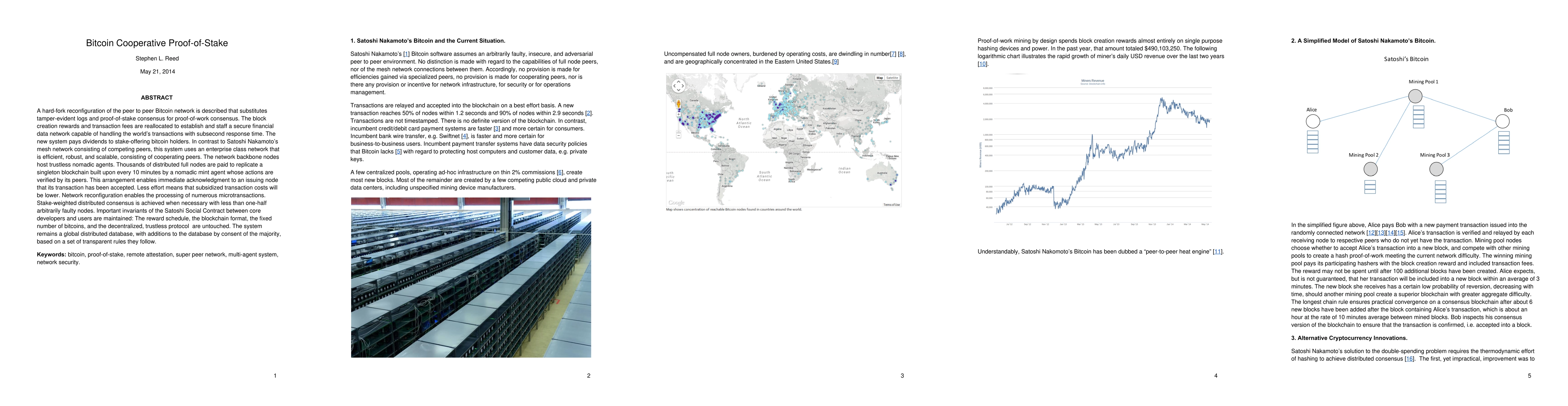 This paper proposes a Bitcoin network reconfiguration using proof-of-stake and tamper-evident logs, replacing proof-of-work to create a cooperative, efficient, and scalable financial data network. The new system maintains core Bitcoin principles while enabling lower transaction costs and microtransactions.