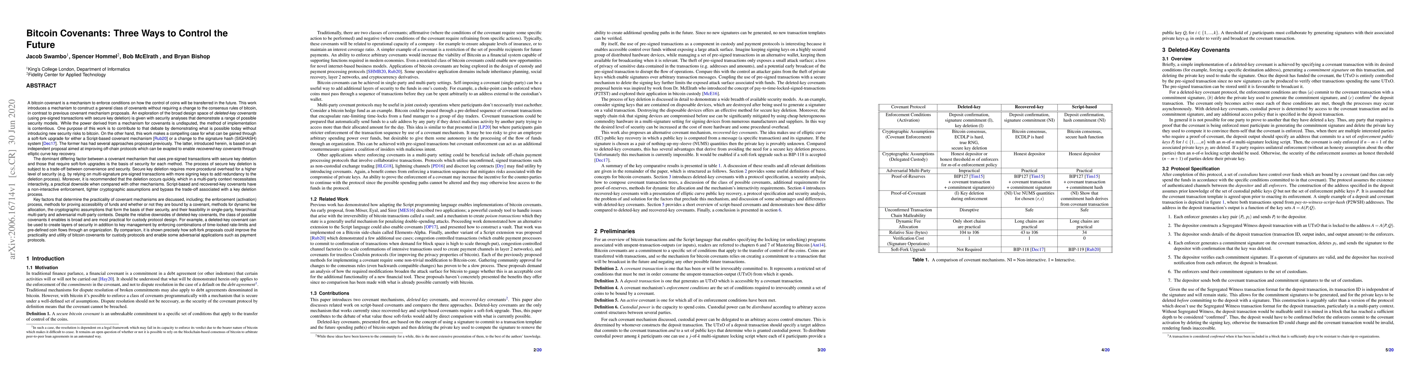 This paper explores bitcoin covenants, mechanisms enforcing conditions on future coin transfers, introducing deleted-key covenants and comparing them to recovered-key covenants enabled by a soft-fork upgrade. It discusses the trade-offs in security and convenience, and evaluates the feasibility of these mechanisms in various contexts.