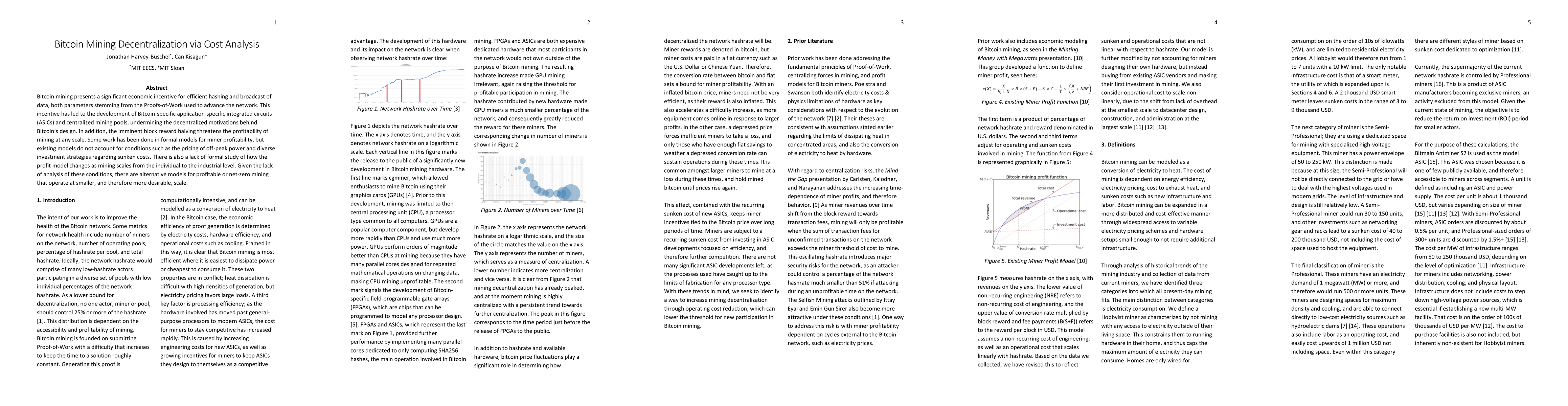 This paper examines Bitcoin mining decentralization through cost analysis, highlighting how centralized mining and specific ASICs undermine Bitcoin's decentralized ethos. It proposes alternative, smaller-scale mining models that could be profitable under varying conditions, including off-peak power pricing and diverse investment strategies.