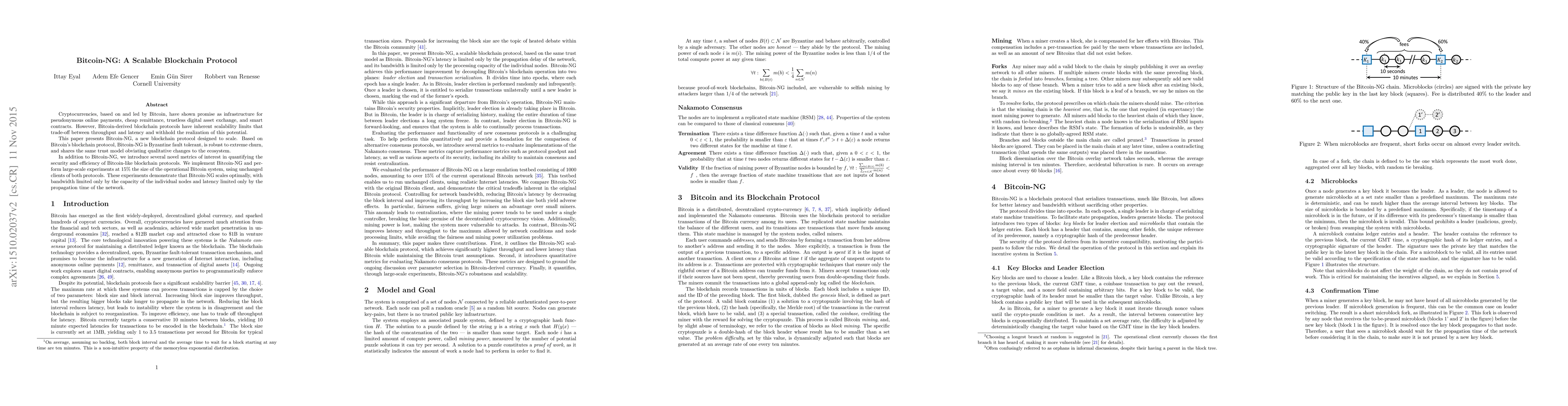 The paper presents Bitcoin-NG, a new blockchain protocol built on Bitcoin's protocol, designed to scale while maintaining Byzantine fault tolerance, robustness to churn, and the same trust model. It was implemented and tested using unchanged clients at 15% the size of the operational Bitcoin system through large-scale experiments.