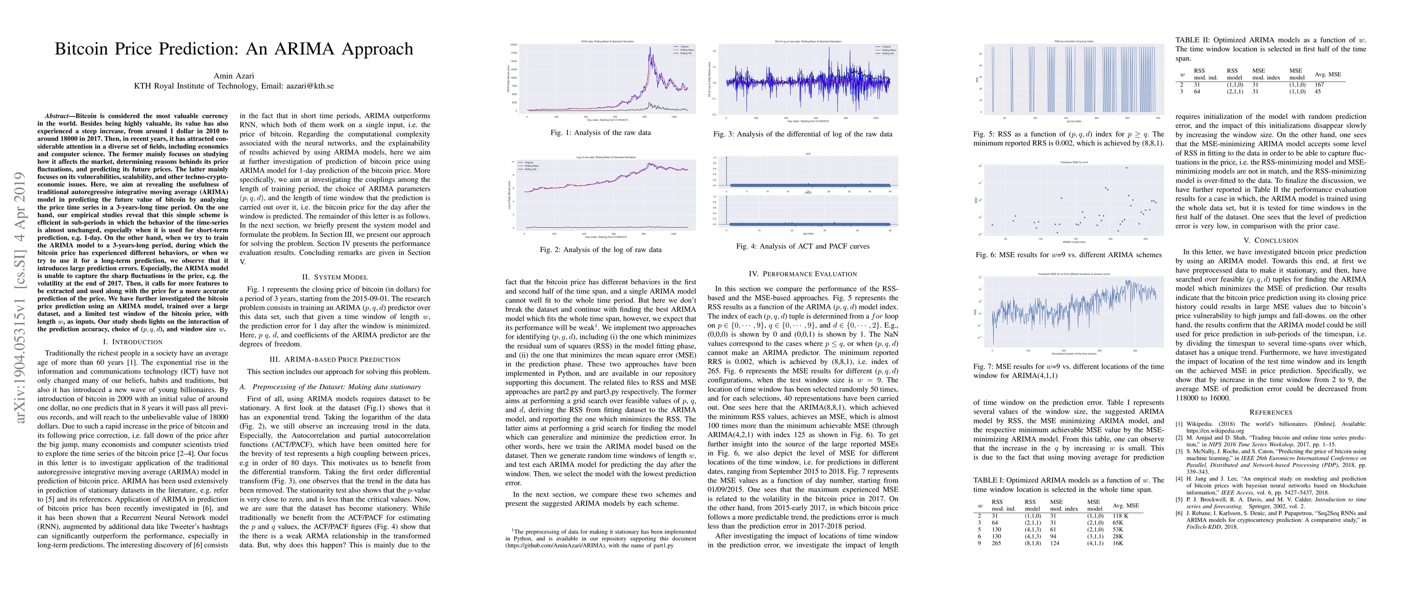 Bitcoin is considered the most valuable currency in the world. Besides being highly valuable, its value has also experienced a steep increase, from around 1 dollar in 2010 to around 18000 in 2017. Then, in recent years, it has attracted considerable attention in a diverse set of fields, including economics and computer science. The former mainly focuses on studying how it affects the market, determining reasons behinds its price fluctuations, and predicting its future prices. The latter mainly focuses on its vulnerabilities, scalability, and other techno-crypto-economic issues. Here, we aim at revealing the usefulness of traditional autoregressive integrative moving average (ARIMA) model in predicting the future value of bitcoin by analyzing the price time series in a 3-years-long time period. On the one hand, our empirical studies reveal that this simple scheme is efficient in sub-periods in which the behavior of the time-series is almost unchanged, especially when it is used for short-term prediction, e.g. 1-day. On the other hand, when we try to train the ARIMA model to a 3-years-long period, during which the bitcoin price has experienced different behaviors, or when we try to use it for a long-term prediction, we observe that it introduces large prediction errors. Especially, the ARIMA model is unable to capture the sharp fluctuations in the price, e.g. the volatility at the end of 2017. Then, it calls for more features to be extracted and used along with the price for a more accurate prediction of the price. We have further investigated the bitcoin price prediction using an ARIMA model, trained over a large dataset, and a limited test window of the bitcoin price, with length $w$, as inputs. Our study sheds lights on the interaction of the prediction accuracy, choice of ($p,q,d$), and window size $w$.