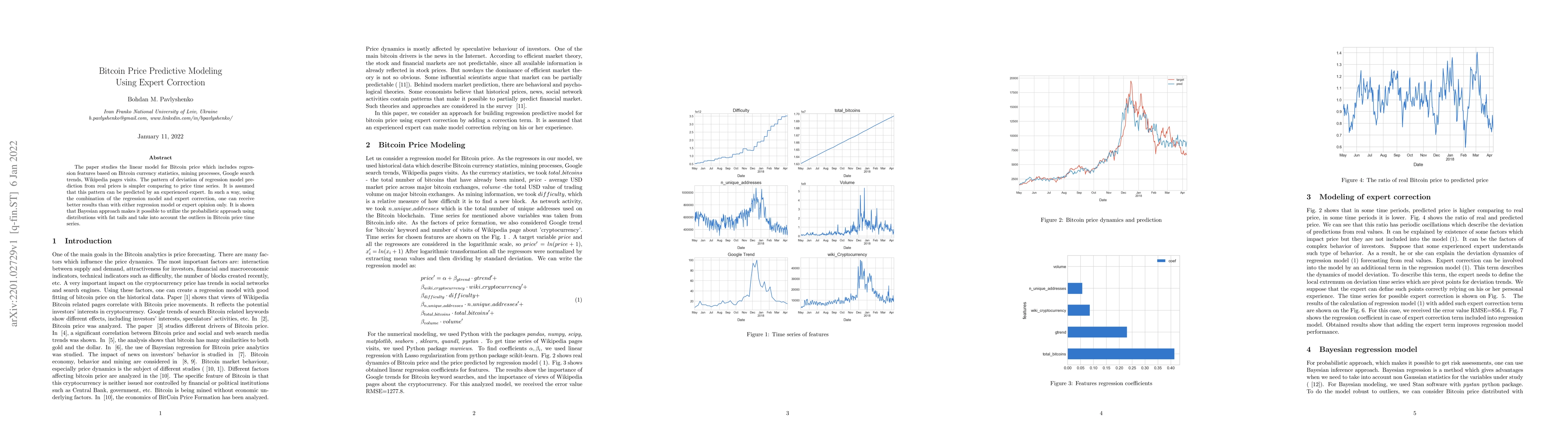 The paper studies the linear model for Bitcoin price which includes regression features based on Bitcoin currency statistics, mining processes, Google search trends, Wikipedia pages visits. The pattern of deviation of regression model prediction from real prices is simpler comparing to price time series. It is assumed that this pattern can be predicted by an experienced expert. In such a way, using the combination of the regression model and expert correction, one can receive better results than with either regression model or expert opinion only. It is shown that Bayesian approach makes it possible to utilize the probabilistic approach using distributions with fat tails and take into account the outliers in Bitcoin price time series.