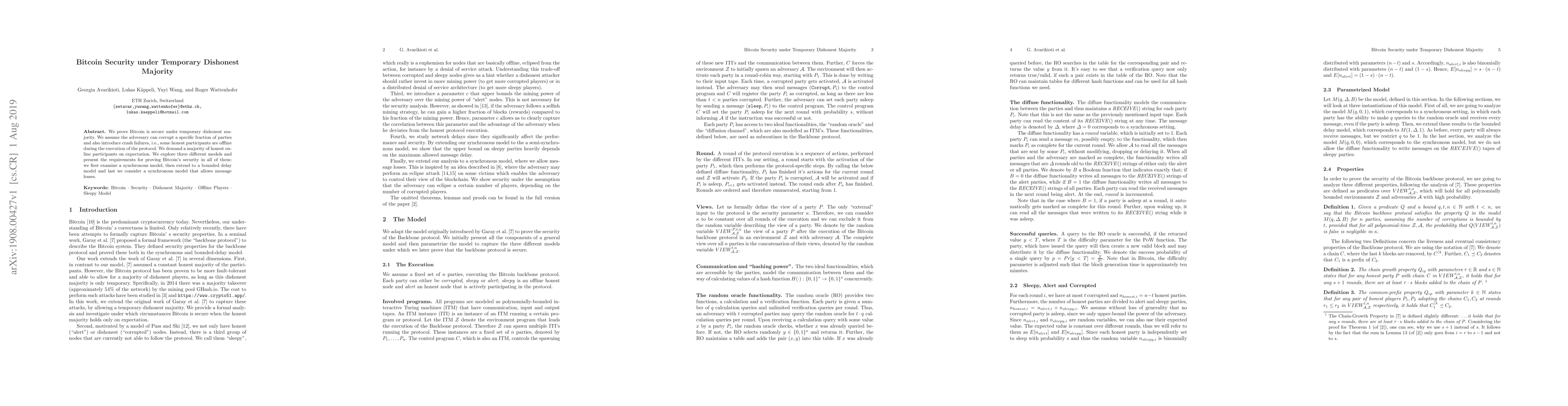 We prove Bitcoin is secure under temporary dishonest majority. We assume the adversary can corrupt a specific fraction of parties and also introduce crash failures, i.e., some honest participants are offline during the execution of the protocol. We demand a majority of honest online participants on expectation. We explore three different models and present the requirements for proving Bitcoin's security in all of them: we first examine a synchronous model, then extend to a bounded delay model and last we consider a synchronous model that allows message losses.