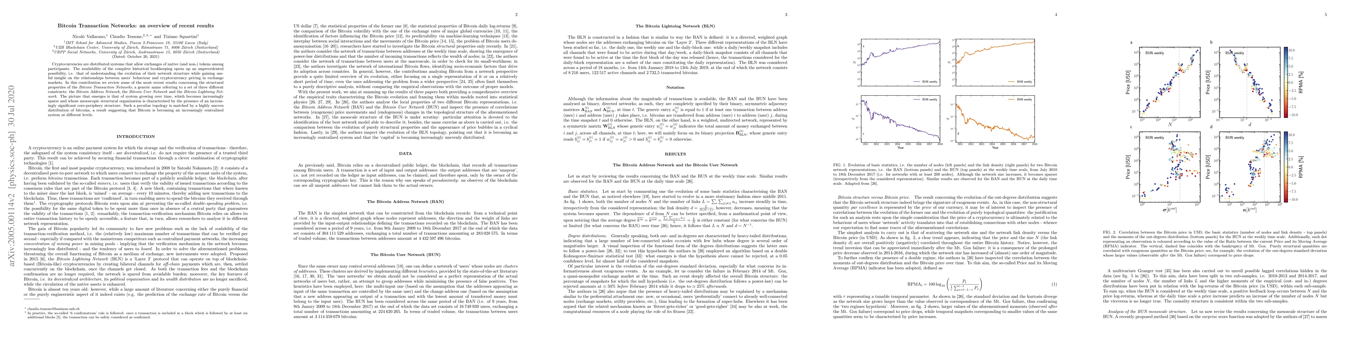 Cryptocurrencies are distributed systems that allow exchanges of native (and non-) tokens among participants. The complete historical bookkeeping and its wide availability opens up an unprecedented possibility, i.e. that of understanding the evolution of their network structure while gaining useful insight on the relationships between user' behaviour and cryptocurrency pricing in exchange markets. In this contribution we review some of the most recent results concerning the structural properties of Bitcoin Transaction Networks, a generic name referring to a set of different constructs: the Bitcoin Address Network, the Bitcoin User Network and the Bitcoin Lightning Network. The picture that emerges is that of system growing over time, which becomes increasingly sparse and whose mesoscopic structural organization is characterised by the presence of an increasingly significant core-periphery structure. Such a peculiar topology is matched by a highly uneven distribution of bitcoins, a result suggesting that Bitcoin is becoming an increasingly centralized system at different levels.