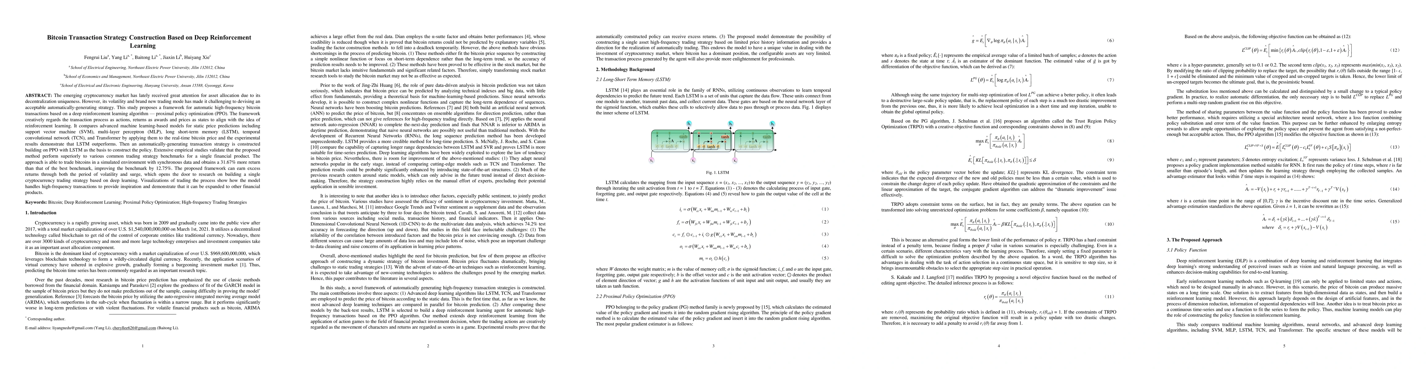The emerging cryptocurrency market has lately received great attention for asset allocation due to its decentralization uniqueness. However, its volatility and brand new trading mode have made it challenging to devising an acceptable automatically-generating strategy. This study proposes a framework for automatic high-frequency bitcoin transactions based on a deep reinforcement learning algorithm-proximal policy optimization (PPO). The framework creatively regards the transaction process as actions, returns as awards and prices as states to align with the idea of reinforcement learning. It compares advanced machine learning-based models for static price predictions including support vector machine (SVM), multi-layer perceptron (MLP), long short-term memory (LSTM), temporal convolutional network (TCN), and Transformer by applying them to the real-time bitcoin price and the experimental results demonstrate that LSTM outperforms. Then an automatically-generating transaction strategy is constructed building on PPO with LSTM as the basis to construct the policy. Extensive empirical studies validate that the proposed method performs superiorly to various common trading strategy benchmarks for a single financial product. The approach is able to trade bitcoins in a simulated environment with synchronous data and obtains a 31.67% more return than that of the best benchmark, improving the benchmark by 12.75%. The proposed framework can earn excess returns through both the period of volatility and surge, which opens the door to research on building a single cryptocurrency trading strategy based on deep learning. Visualizations of trading the process show how the model handles high-frequency transactions to provide inspiration and demonstrate that it can be expanded to other financial products.