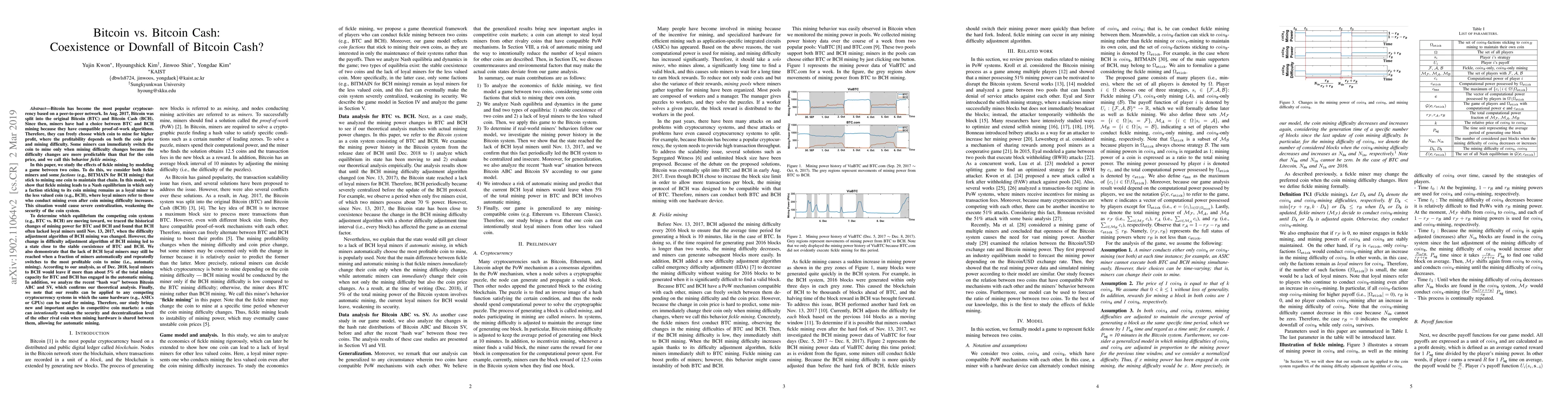 This paper explores the dynamics between Bitcoin (BTC) and Bitcoin Cash (BCH) post-split in 2017, focusing on "fickle mining" where miners switch between coins based on profitability. The study models a game between the two coins, showing that fickle mining leads to a Nash equilibrium favoring factions that stick to one coin, potentially causing severe centralization and weakening the security of the less valued coin (BCH).