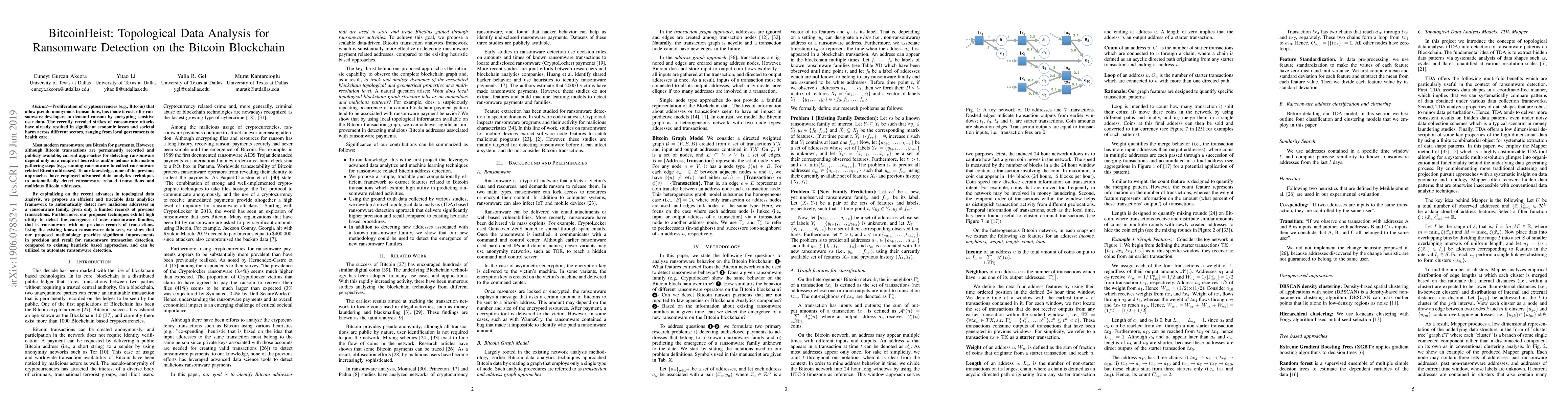 The paper proposes a novel topological data analysis framework to automatically detect ransomware-related Bitcoin transactions and malicious addresses, significantly improving precision and recall compared to heuristic-based methods. This advanced analytics approach can identify new ransomware families with no prior transaction records, offering a powerful tool for automated ransomware detection.
