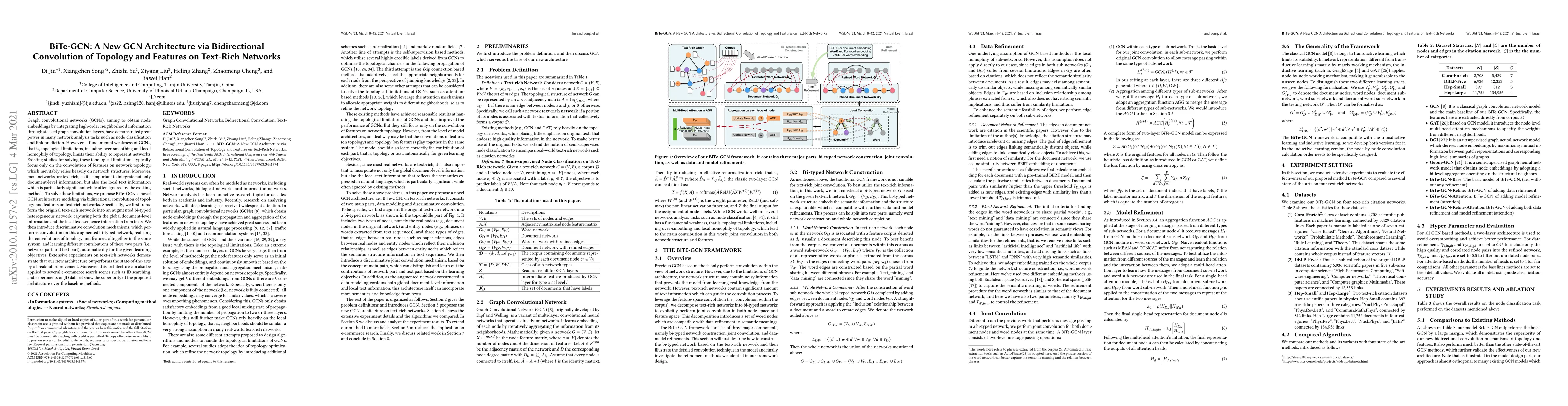 Graph convolutional networks (GCNs), aiming to integrate high-order neighborhood information through stacked graph convolution layers, have demonstrated remarkable power in many network analysis tasks. However, topological limitations, including over-smoothing and local topology homophily, limit its capability to represent networks. Existing studies only perform feature convolution on network topology, which inevitably introduces unbalance between topology and features. Considering that in real world, the information network consists of not only the node-level citation information but also the local text-sequence information. We propose BiTe-GCN, a novel GCN architecture with bidirectional convolution of both topology and features on text-rich networks to solve these limitations. We first transform the original text-rich network into an augmented bi-typed heterogeneous network, capturing both the global node-level information and the local text-sequence information from texts. We then introduce discriminative convolution mechanisms to performs convolutions of both topology and features simultaneously. Extensive experiments on text-rich networks demonstrate that our new architecture outperforms state-of-the-art by a breakout improvement. Moreover, this architecture can also be applied to several e-commerce searching scenes such as JD searching. The experiments on the JD dataset validate the superiority of the proposed architecture over the related methods.