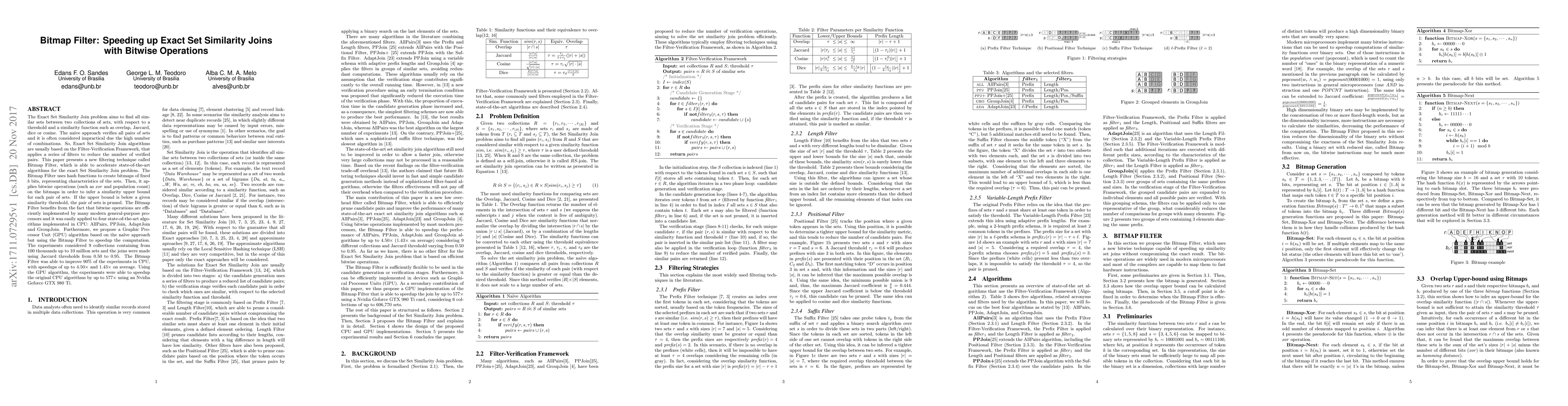 A new filtering technique called Bitmap Filter accelerates state-of-the-art algorithms for exact Set Similarity Join problem, improving 90% of CPU experiments with up to 4.50x speedups.