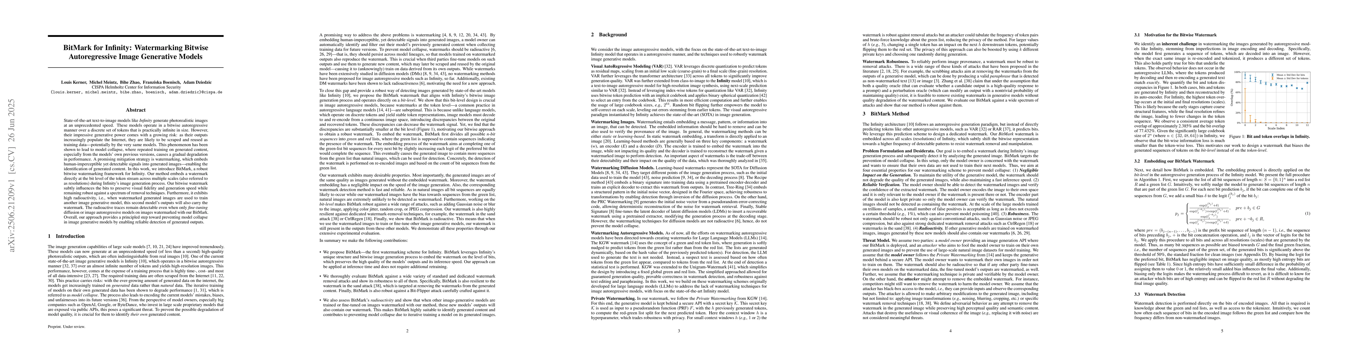 State-of-the-art text-to-image models like Infinity generate photorealistic images at an unprecedented speed. These models operate in a bitwise autoregressive manner over a discrete set of tokens that is practically infinite in size. However, their impressive generative power comes with a growing risk: as their outputs increasingly populate the Internet, they are likely to be scraped and reused as training data-potentially by the very same models. This phenomenon has been shown to lead to model collapse, where repeated training on generated content, especially from the models' own previous versions, causes a gradual degradation in performance. A promising mitigation strategy is watermarking, which embeds human-imperceptible yet detectable signals into generated images-enabling the identification of generated content. In this work, we introduce BitMark, a robust bitwise watermarking framework for Infinity. Our method embeds a watermark directly at the bit level of the token stream across multiple scales (also referred to as resolutions) during Infinity's image generation process. Our bitwise watermark subtly influences the bits to preserve visual fidelity and generation speed while remaining robust against a spectrum of removal techniques. Furthermore, it exhibits high radioactivity, i.e., when watermarked generated images are used to train another image generative model, this second model's outputs will also carry the watermark. The radioactive traces remain detectable even when only fine-tuning diffusion or image autoregressive models on images watermarked with our BitMark. Overall, our approach provides a principled step toward preventing model collapse in image generative models by enabling reliable detection of generated outputs.