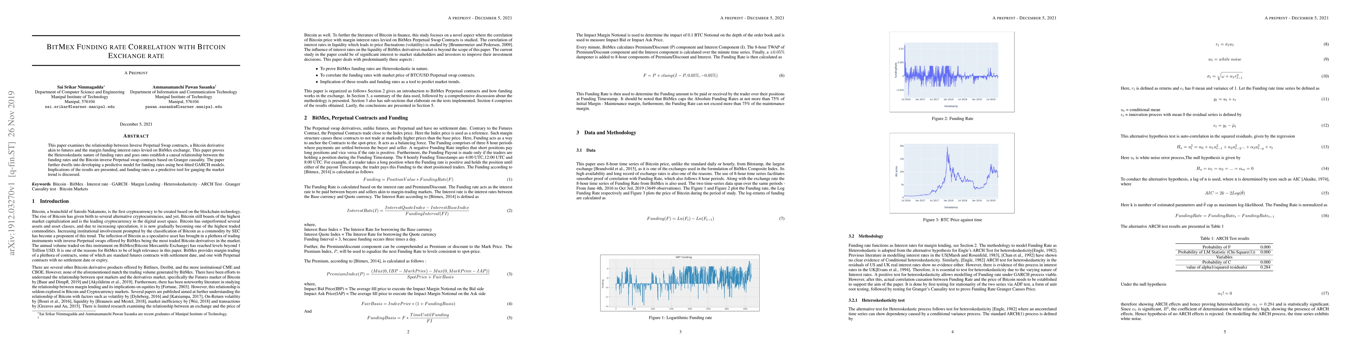 This paper examines the relationship between Inverse Perpetual Swap contracts, a Bitcoin derivative akin to futures and the margin funding interest rates levied on BitMEX. This paper proves the Heteroskedastic nature of funding rates and goes onto establish a causal relationship between the funding rates and the Bitcoin inverse Perpetual swap contracts based on Granger causality. The paper further dwells into developing a predictive model for funding rates using best-fitted GARCH models. Implications of the results are presented, and funding rates as a predictive tool for gauging the market trend is discussed.