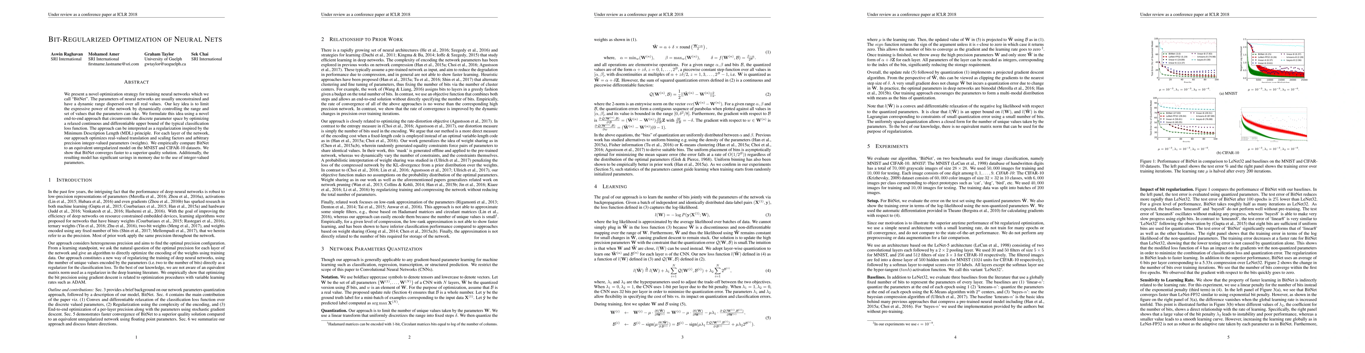We present a novel optimization strategy for training neural networks which we call "BitNet". The parameters of neural networks are usually unconstrained and have a dynamic range dispersed over all real values. Our key idea is to limit the expressive power of the network by dynamically controlling the range and set of values that the parameters can take. We formulate this idea using a novel end-to-end approach that circumvents the discrete parameter space by optimizing a relaxed continuous and differentiable upper bound of the typical classification loss function. The approach can be interpreted as a regularization inspired by the Minimum Description Length (MDL) principle. For each layer of the network, our approach optimizes real-valued translation and scaling factors and arbitrary precision integer-valued parameters (weights). We empirically compare BitNet to an equivalent unregularized model on the MNIST and CIFAR-10 datasets. We show that BitNet converges faster to a superior quality solution. Additionally, the resulting model has significant savings in memory due to the use of integer-valued parameters.