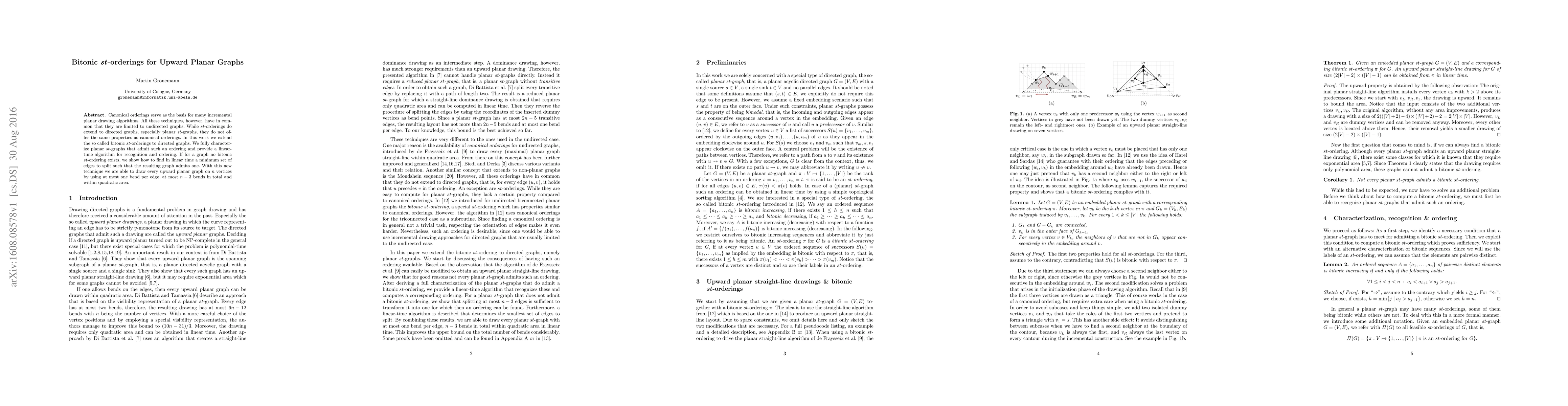 This paper extends bitonic $st$-orderings to directed planar graphs, providing a linear-time algorithm for their recognition and construction. It ensures that every upward planar graph can be drawn with at most one bend per edge and at most $n - 3$ bends total within a quadratic area.