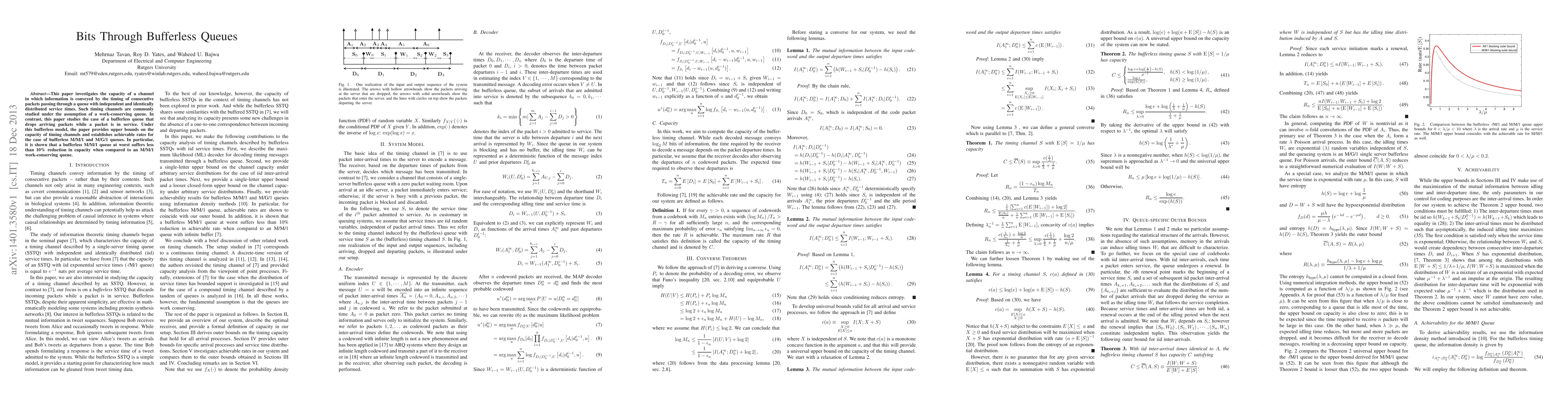 This paper explores the capacity of timing channels through bufferless queues, which drop packets when a packet is in service. It provides upper bounds on capacity and achievable rates for bufferless M/M/1 and M/G/1 queues, showing that a bufferless M/M/1 queue suffers less than 10% reduction in capacity compared to its work-conserving counterpart.